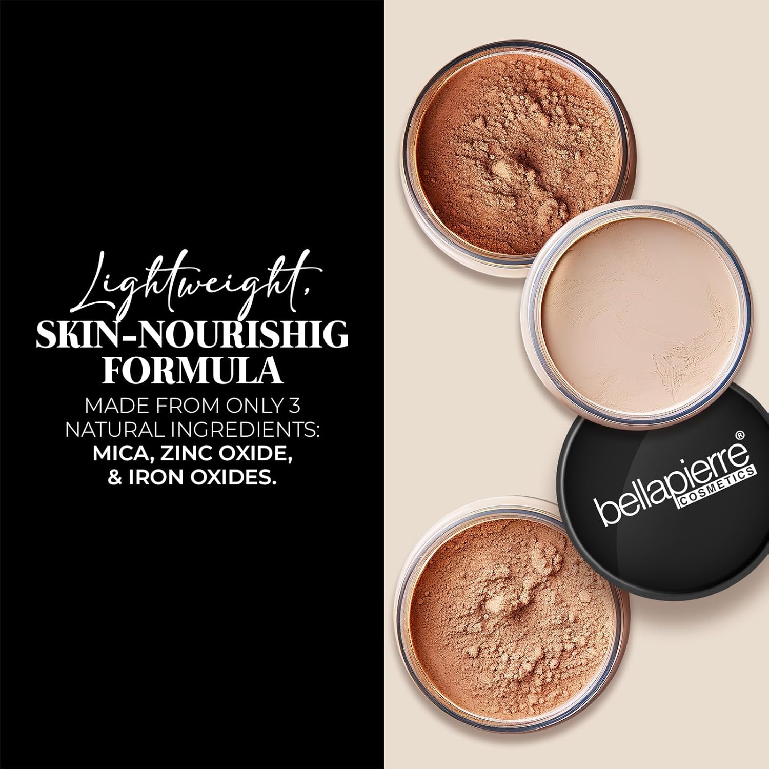 - 5-in-1 Mineral Foundation – All-in-one loose mineral foundation works as a concealer, powder foundation with SPF 15, finishing powder, and setting powder. Full coverage + sun protection in one step