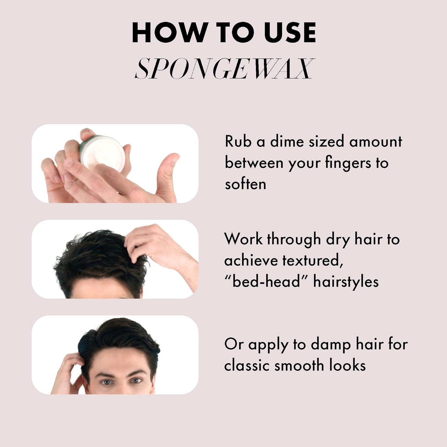 - Easy to Apply, Lasts All Day, Rinses out Clean: Start by rubbing a dime sized amount between your fingers to soften. Then massage and finger comb through hair until you get the right look. Work through dry hair to achieve textured, “bed-head” hairstyles or apply to damp hair for classic smooth looks.