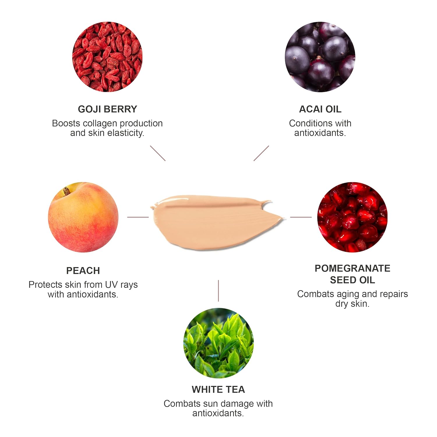 • MOTHER NATURE'S ANTI AGERS - A smooth, lightweight formula helps even out skin tone, perfect for a natural makeup look with the hydrating benefits of antioxidant-rich goji, acai, and pomegranate oils to help combat the appearance of pesky wrinkles.