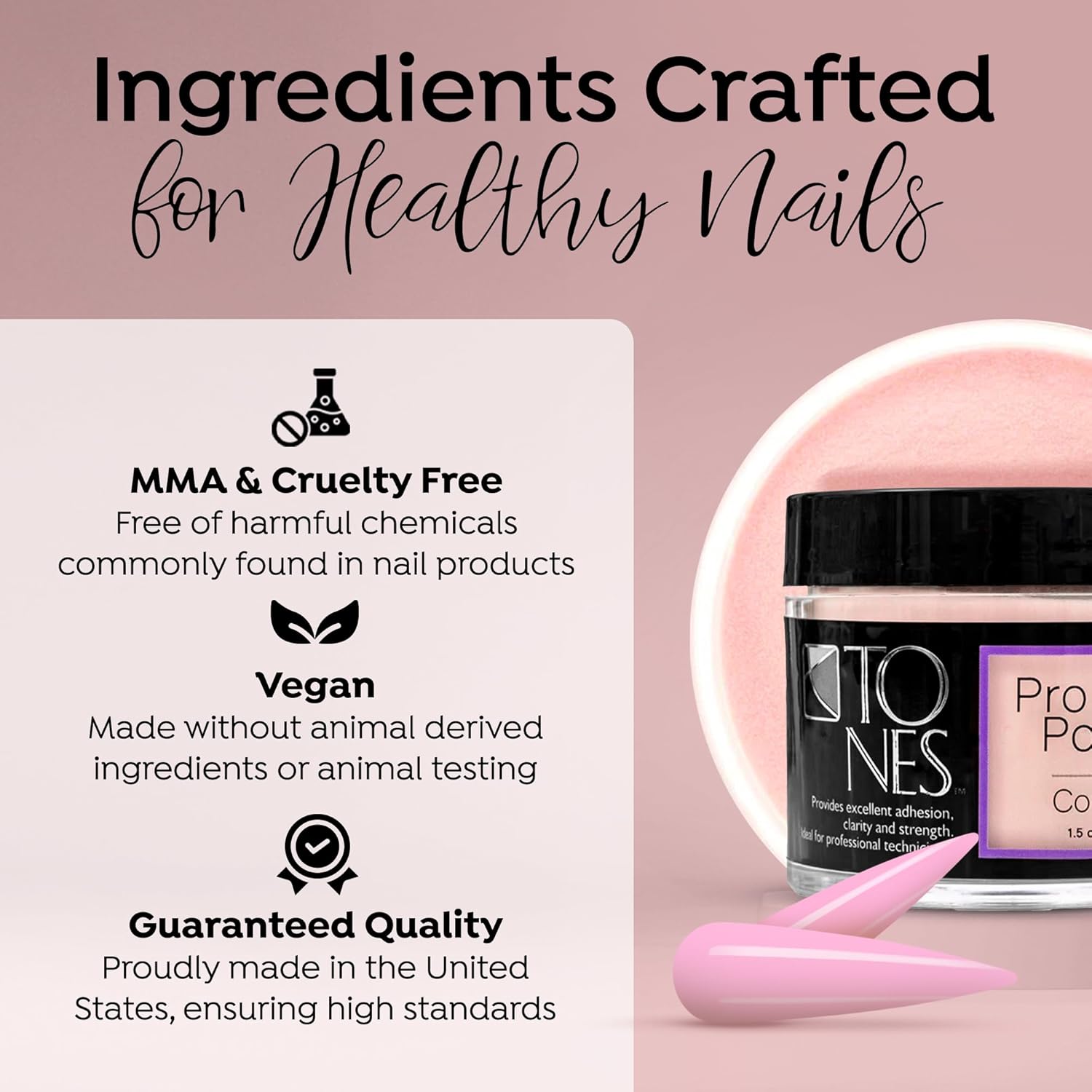 - THE TONES PROMISE: MADE IN THE USA: Trust in a brand that cares. Tones is a family-owned, women-run business proudly crafting professional-grade nail supplies in the USA. We are committed to ethical practices and premium, cruelty-free ingredients, so you can purchase with confidence.