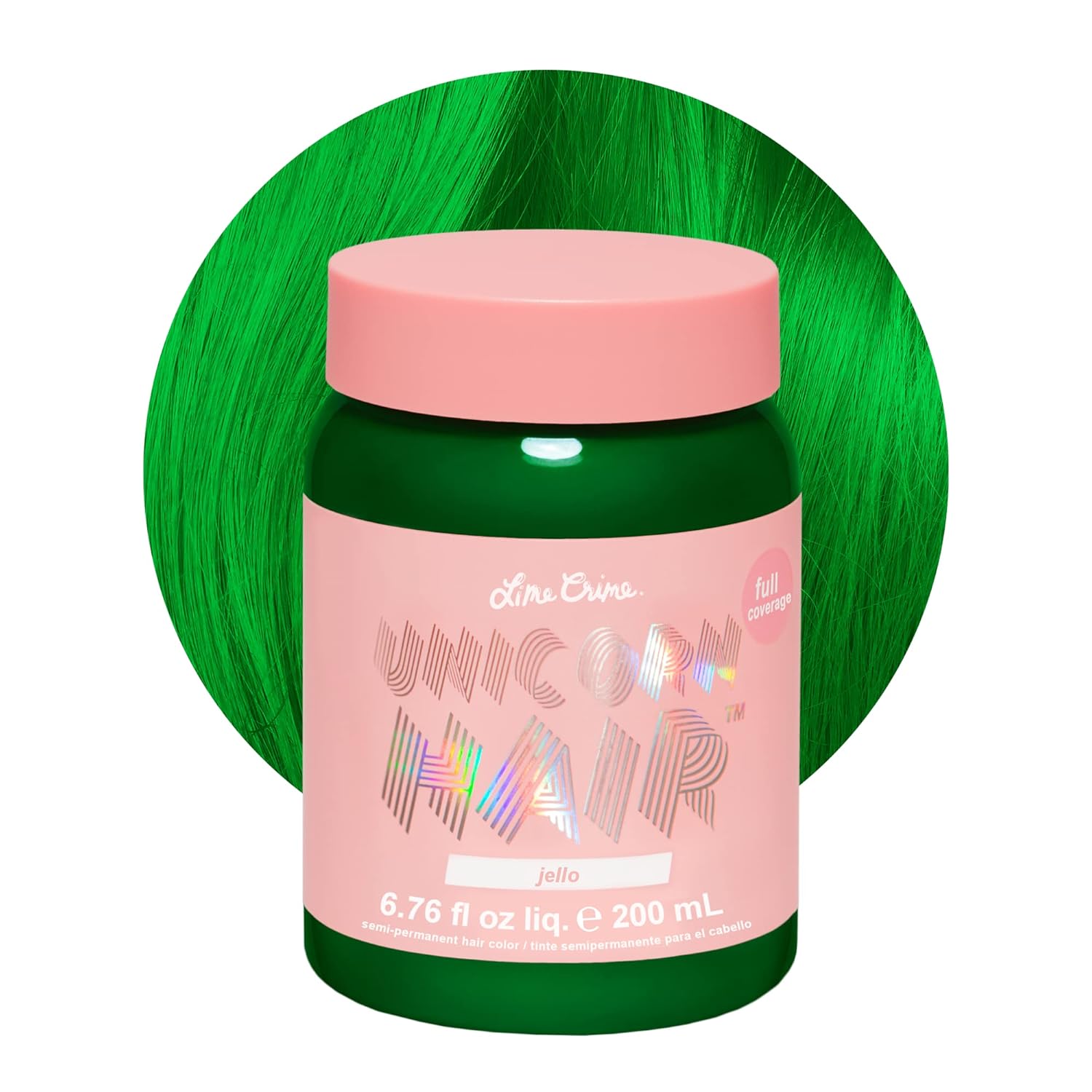 - Jello Unicorn Hair Dye: Dyed and gone to Unicorn Heaven! Lime Crime Unicorn Hair is a DIY-friendly, semi-permanent color dye that transforms hair into vibrant colors... all from the comfort of your own home. Jello is a gorgeous tropical green that will make your fantasy hair color dreams come true, and its sugary citrus v Has anilla scent will make your transformation even sweeter!