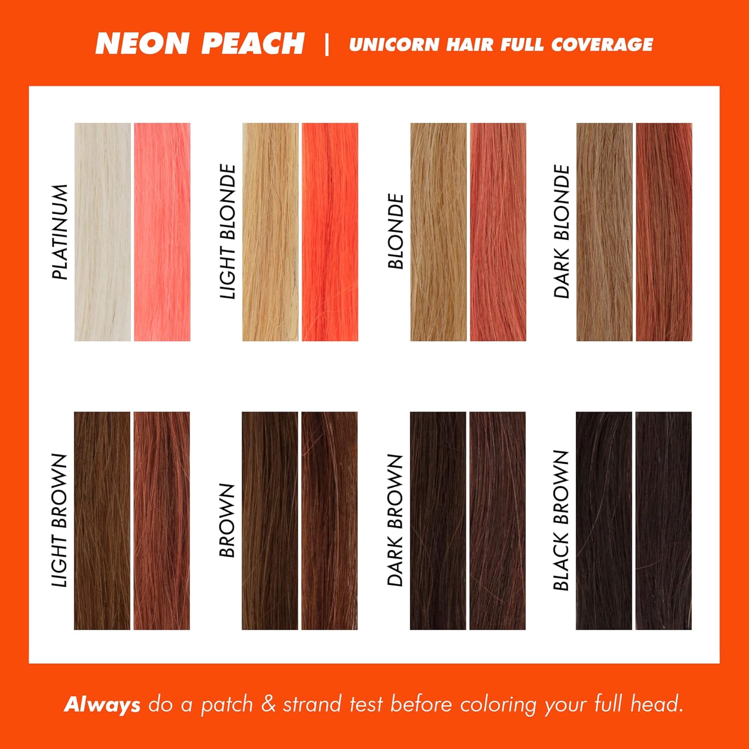 - Neon Peach Unicorn Hair Dye: Dyed and gone to Unicorn Heaven! Lime Crime Unicorn Hair is a DIY-friendly, semi-permanent color dye that transforms hair into vibrant colors... all from the comfort of your own home. Neon Peach is a vibrant peach color that will make your fantasy hair color dreams come true, and its sugary citrus vanilla scent will make your transformation even sweeter!
