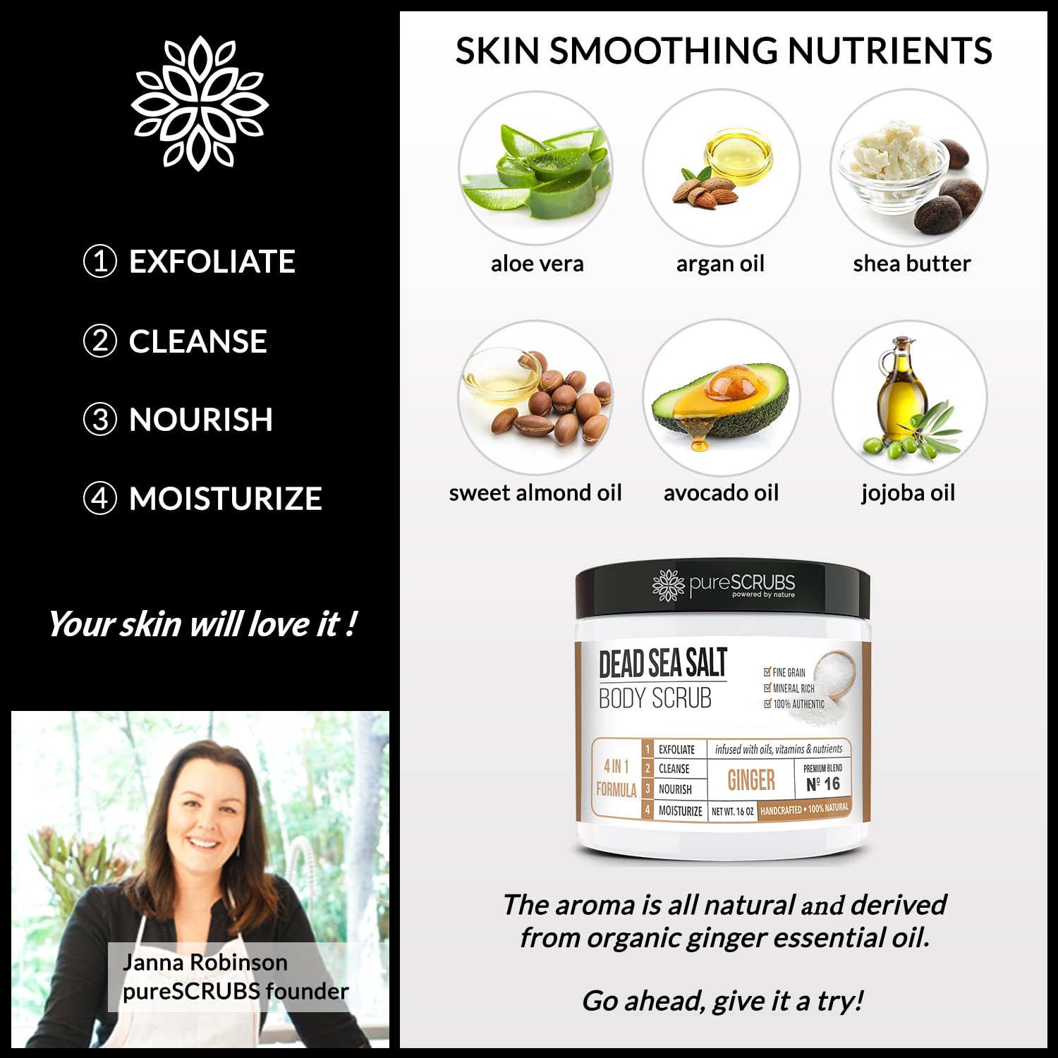 - Product Benefits : Exfoliate, Cleanse, Nourish, Moisturize