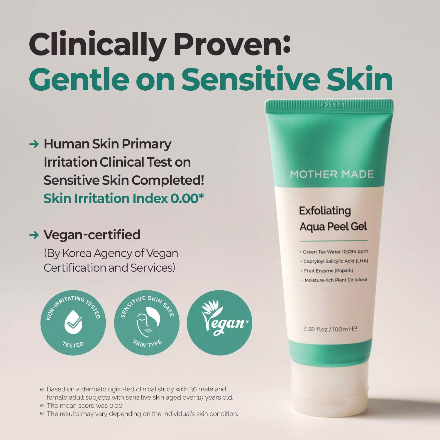 MOTHER MADE LHA Green Tea Exfoliating Aqua Peel Gel, Deep Pore Face Exfoliant, Gentle Facial Exfoliator, Dead Skin Remover, Natural Cellulose for Peeling, Vegan, Korean Skincare (100ml / 3.38 fl.oz)
