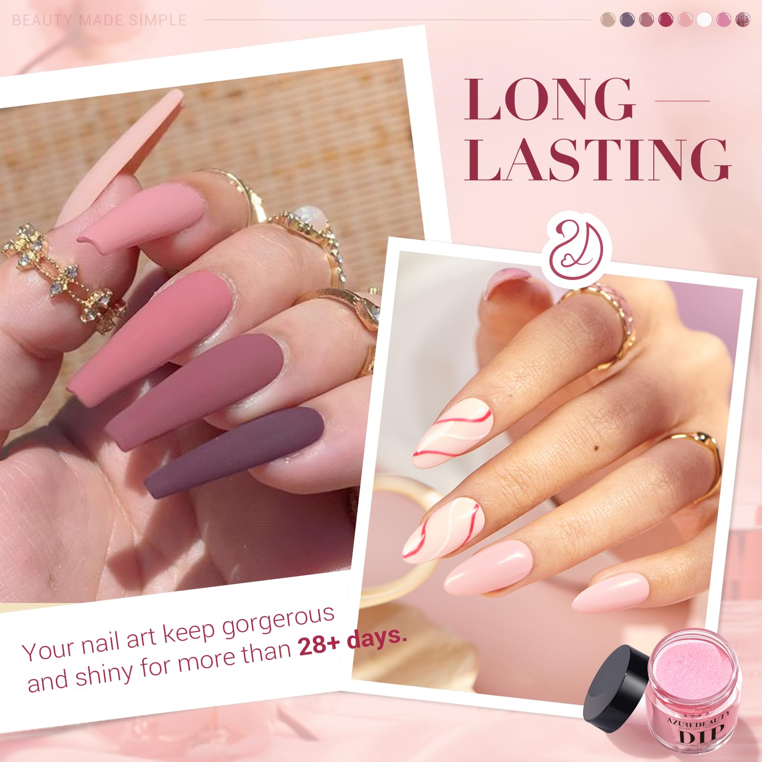 - ăLong Lasting Vibrant ShadesăAzurebeauty nail dip powder kit starter set is long-lasting and anti-chipping, anti-peel off. The color is full and natural-looking, light, and has an impeccable shine finish. It can keep the nail art gorgeous and shiny for more than about 28 days with proper application.