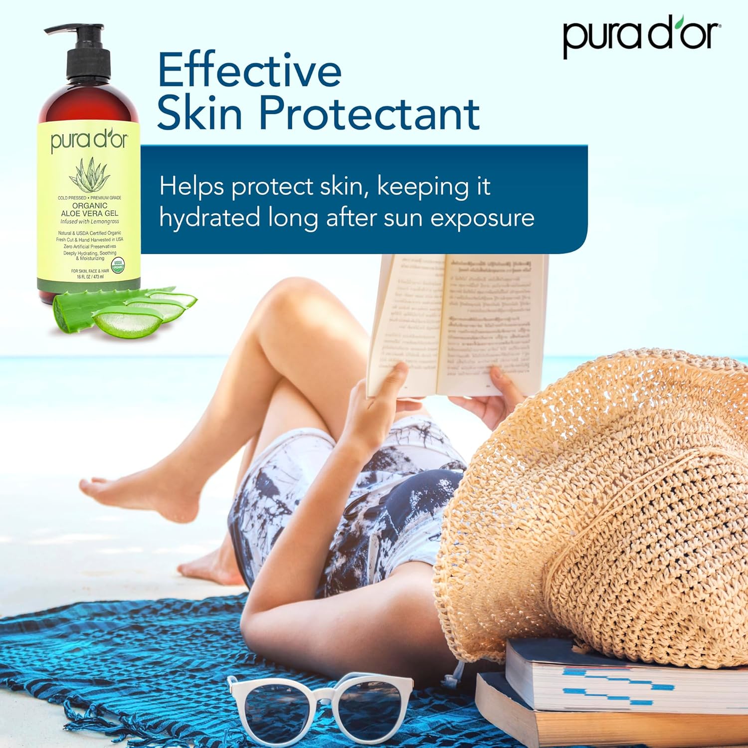 PURA D'OR 16 Oz ORGANIC Aloe Vera Gel - Lemongrass - All Natural - ZERO Artificial Preservatives - Deeply Hydrating & Moisturizing - Sunburn, Bug Bites, Rashes, Small Cuts, Eczema Relief - Skin & Hair