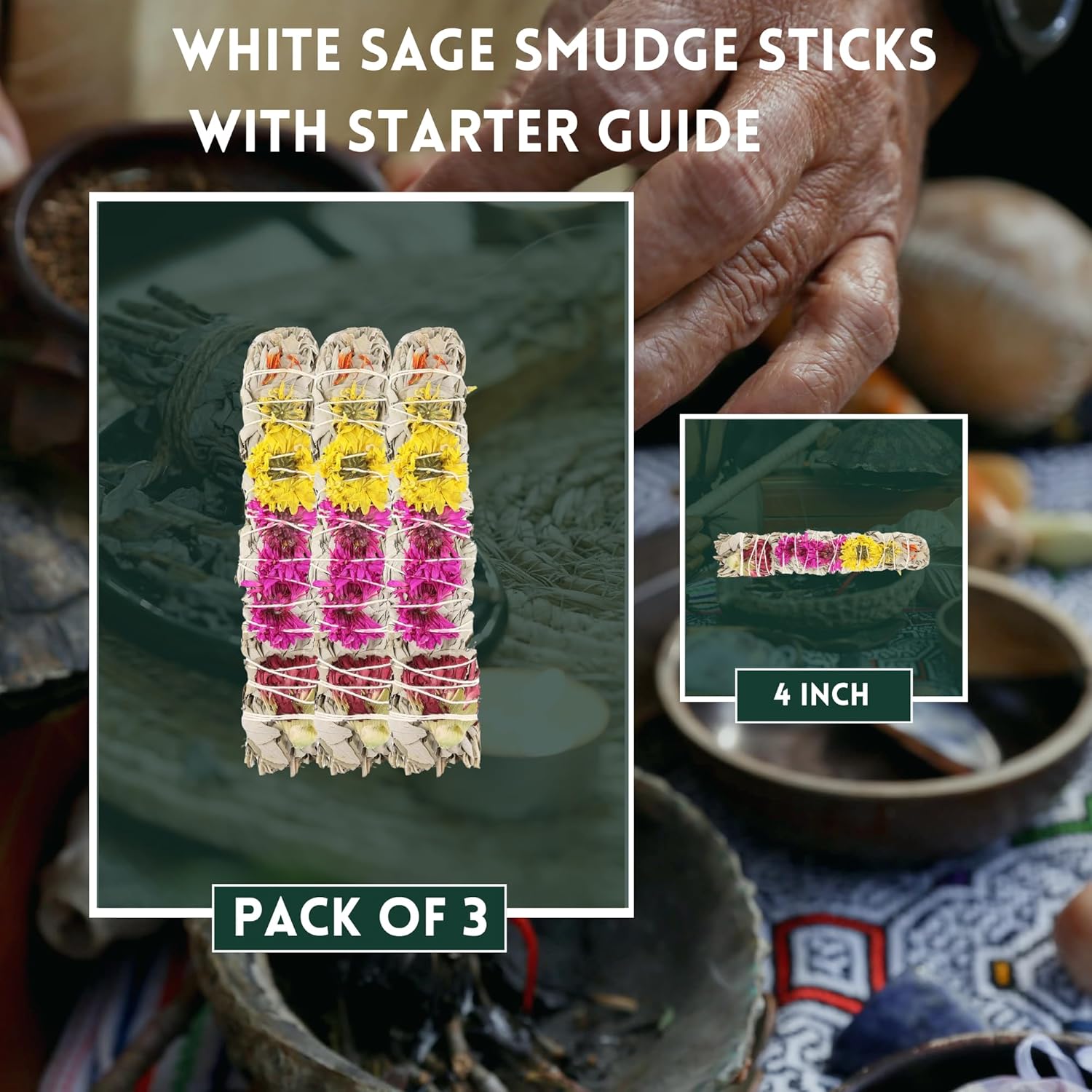 Ancient Veda Joy Organic White Sage Smudge Sticks with Flowers for Cleansing Home, Meditation, Yoga, Healing and Smudging | Sustainably Sourced California White Sage Bundles (3 Pack - 4 Inch)