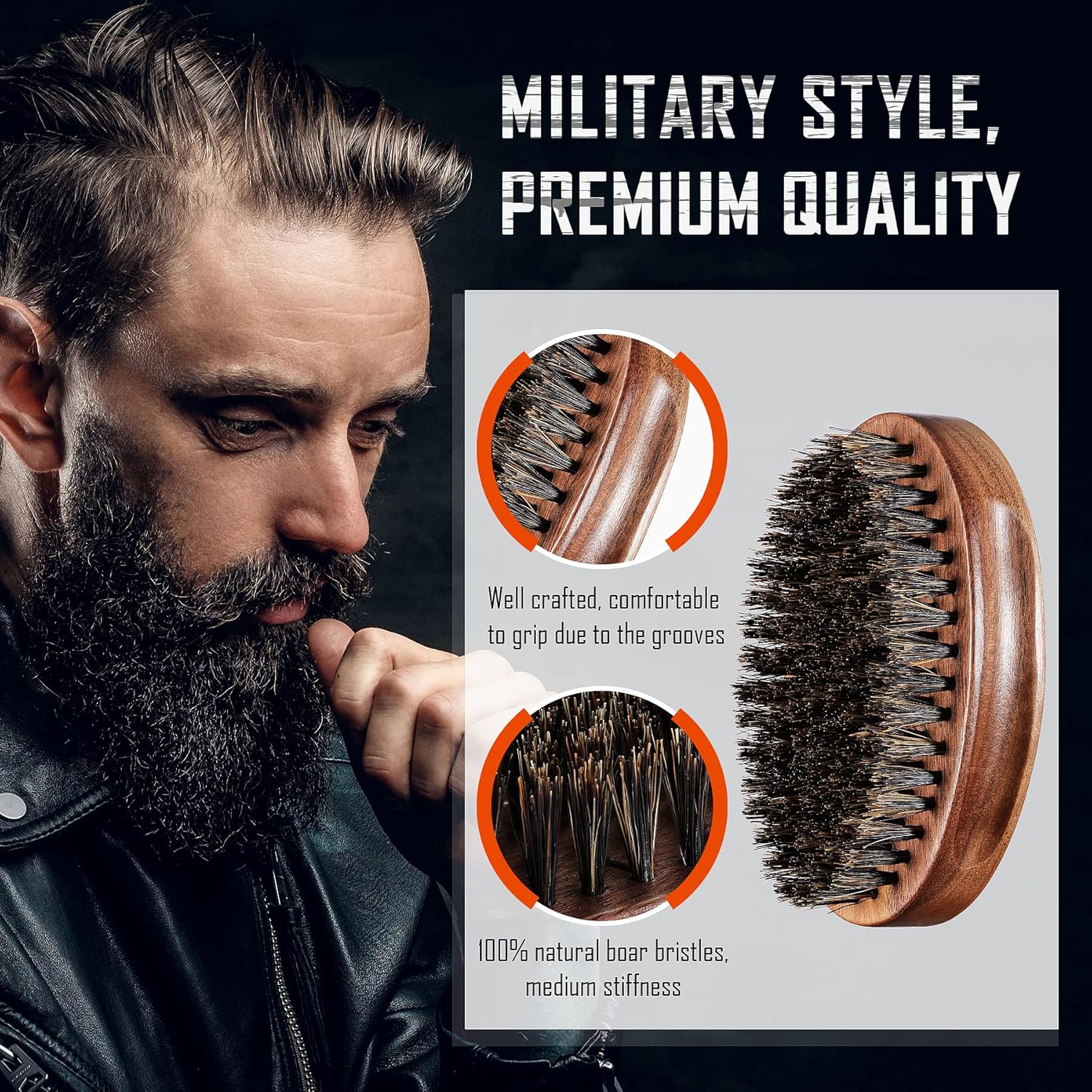 BFWood Boar Bristle Beard Brush - Black Wood Walnut Military Style, Men's Wooden Mustache Brush