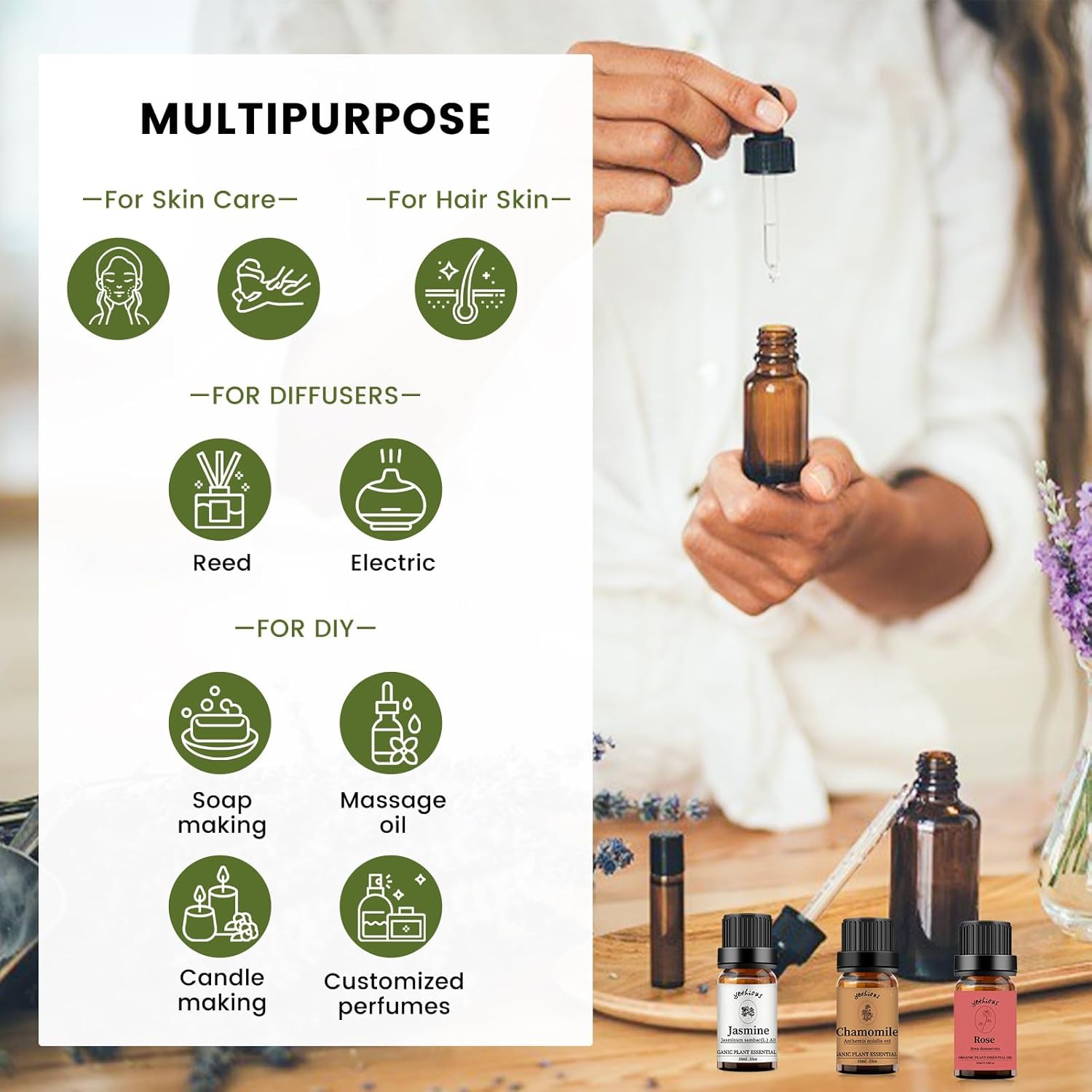 • 100% pure organic rose, jasmine and chamomile essential oil: no additives or fillers. Essential oils are used for aromatherapy, baths, hair care, saunas, air freshening, or soaps and bath, etc.
