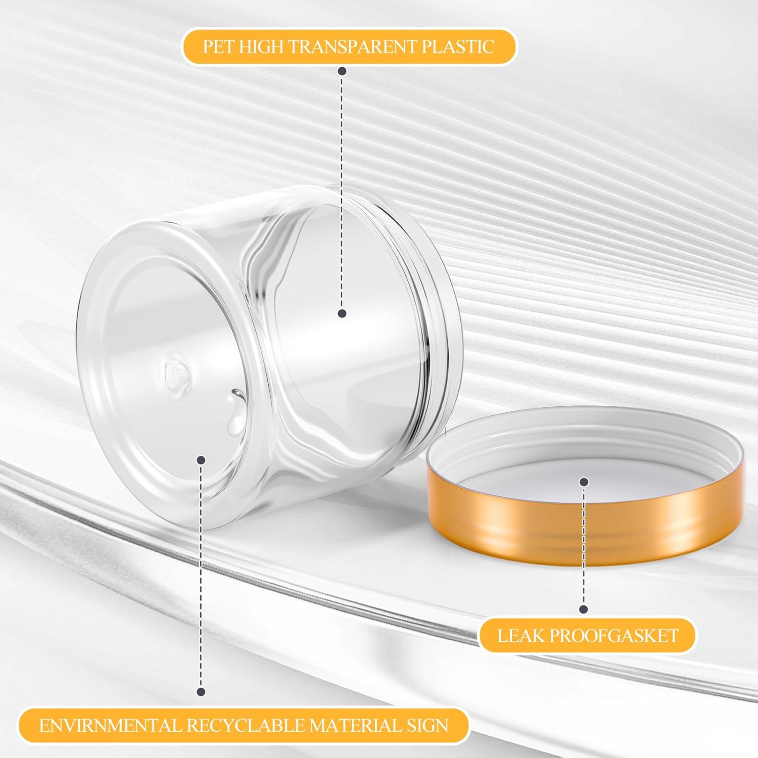 - Quality material: the 1 oz plastic jars with lids are made of quality clear plastic, without odd smell, does not contaminate your skincare products, stable, high temperature resistance, a gold plastic cover with lid, sealed storage and leak proof