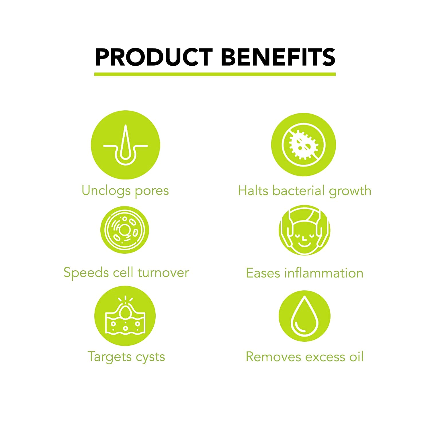 - One Proven Ingredient: We harnessed the healing powers of benzoyl peroxide to help clear and prevent blackheads, whiteheads, pimples and below-the-skin cysts, while easing redness. It also helps to increase cell turnover by removing the mixture of excess oil, dead skin and debris that clogs pores.