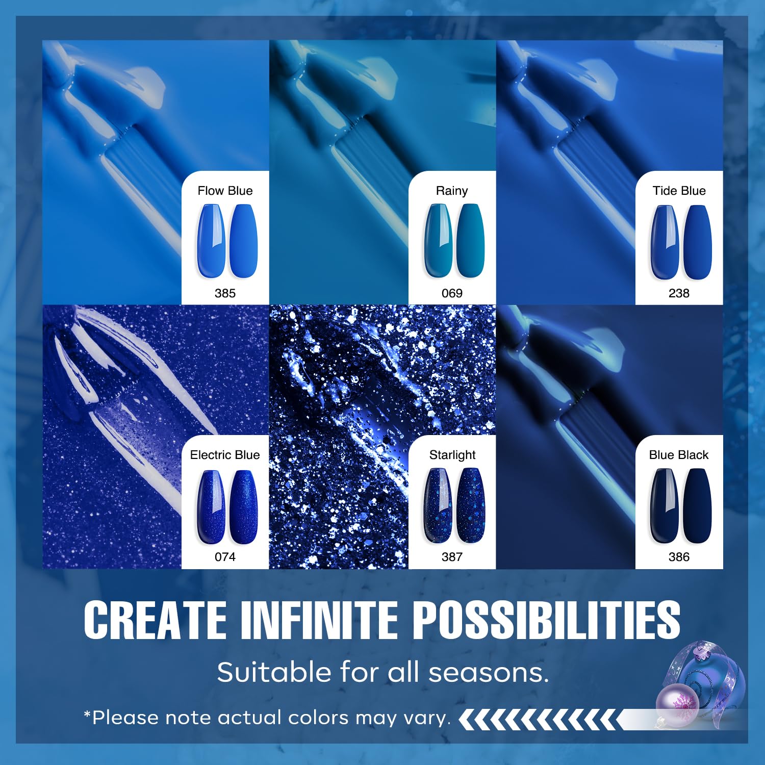 - Blue Glitter 6 Colors: MEFA gel polish set include sapphire blue, navy blue, dark blue, lake blue, peacock blue and blue glitter gel. Different blue represents the sea from near to far, and the blue glitter gel color is the stars reflected from the sea