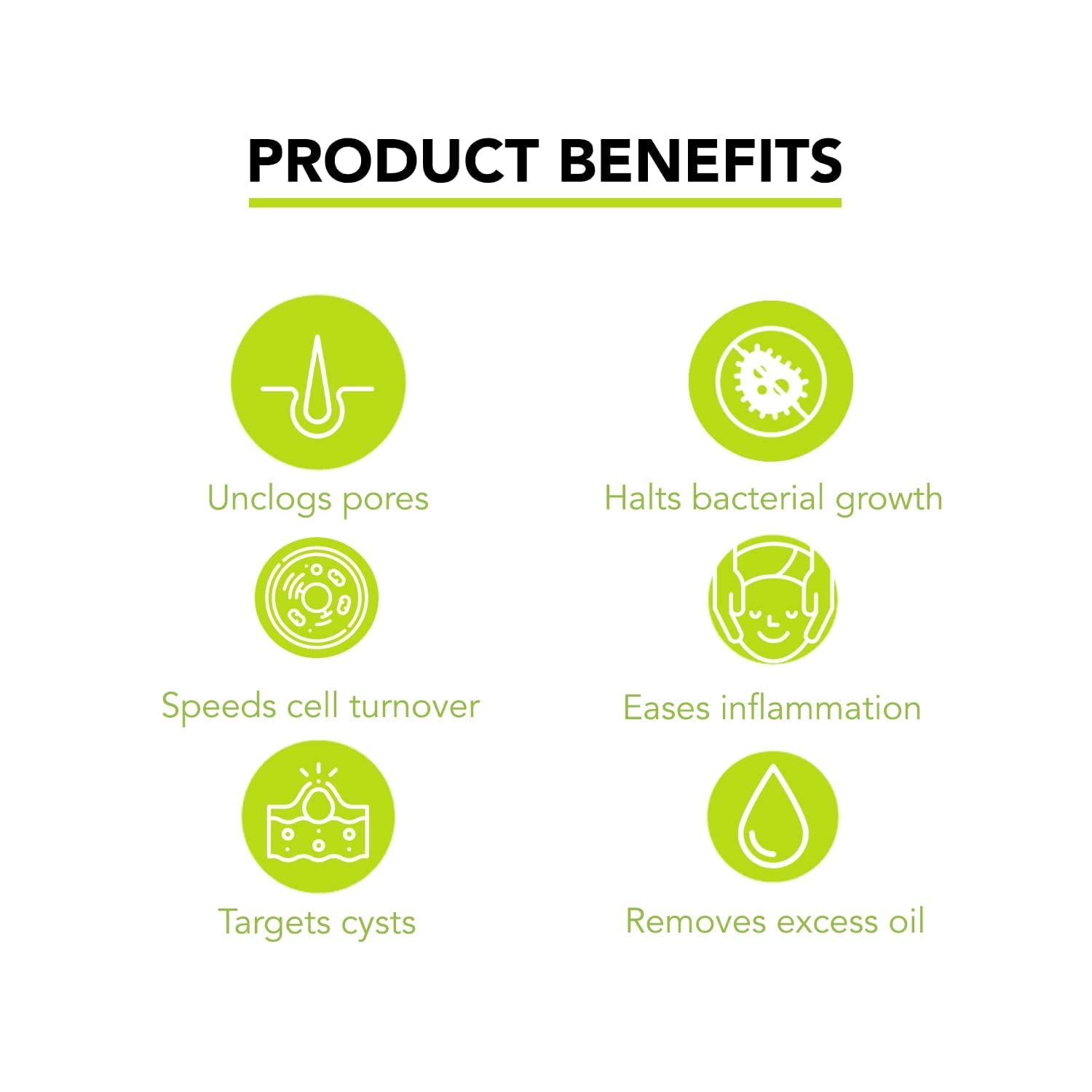 - One Proven Ingredient: We harnessed the healing powers of benzoyl peroxide to help clear and prevent blackheads, whiteheads, pimples and other types of inflammatory acne, while easing redness. It also helps to increase cell turnover by removing the mixture of excess oil, dead skin and debris that clogs pores.