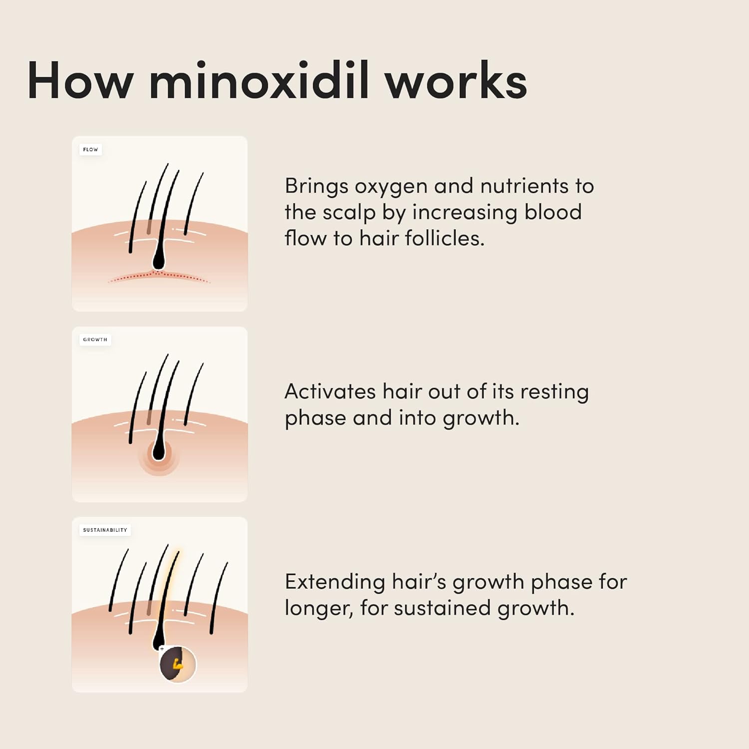 - hims minoxidil foam starts working by bringing oxygen and nutrients to the scalp with increased blood flow to hair follicles. Hair activates from a resting phase into a growth phase. Finally, it extends this growth phase for longer to sustain growth activity
