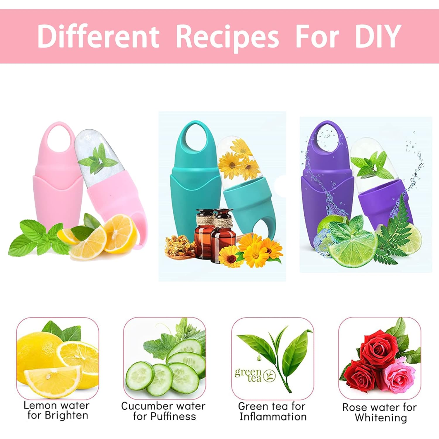 - 3.【Customized recipes】Customized recipes: To truly enhance the skin beautification effect, you can use your creativity to customize another formula according to your specific skin needs, such as whitening lemonade, anti-inflammatory green tea, anti-swelling cucumber water, and skin-improving coconut milk. You can use a juicer to squeeze them into juice, then add water, essential oils and roses to the ice tray, wait for 3-4 hours, then you can use it