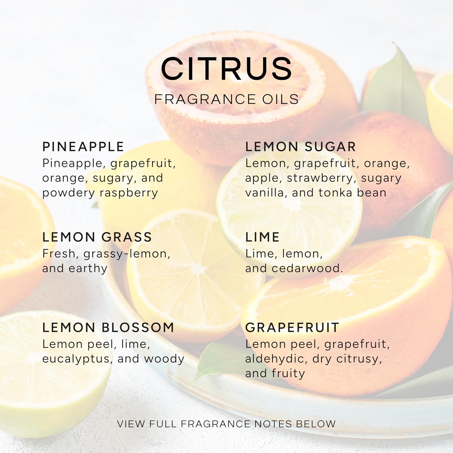 • CITRUS SCENTED OILS: Citrusy smelling scents formulated for making candles, soaps, air freshener sprays, aromatherapy diffusers, dryer sheets and cleaning products. These seasonal essential scents make the perfect gift for the whole family!