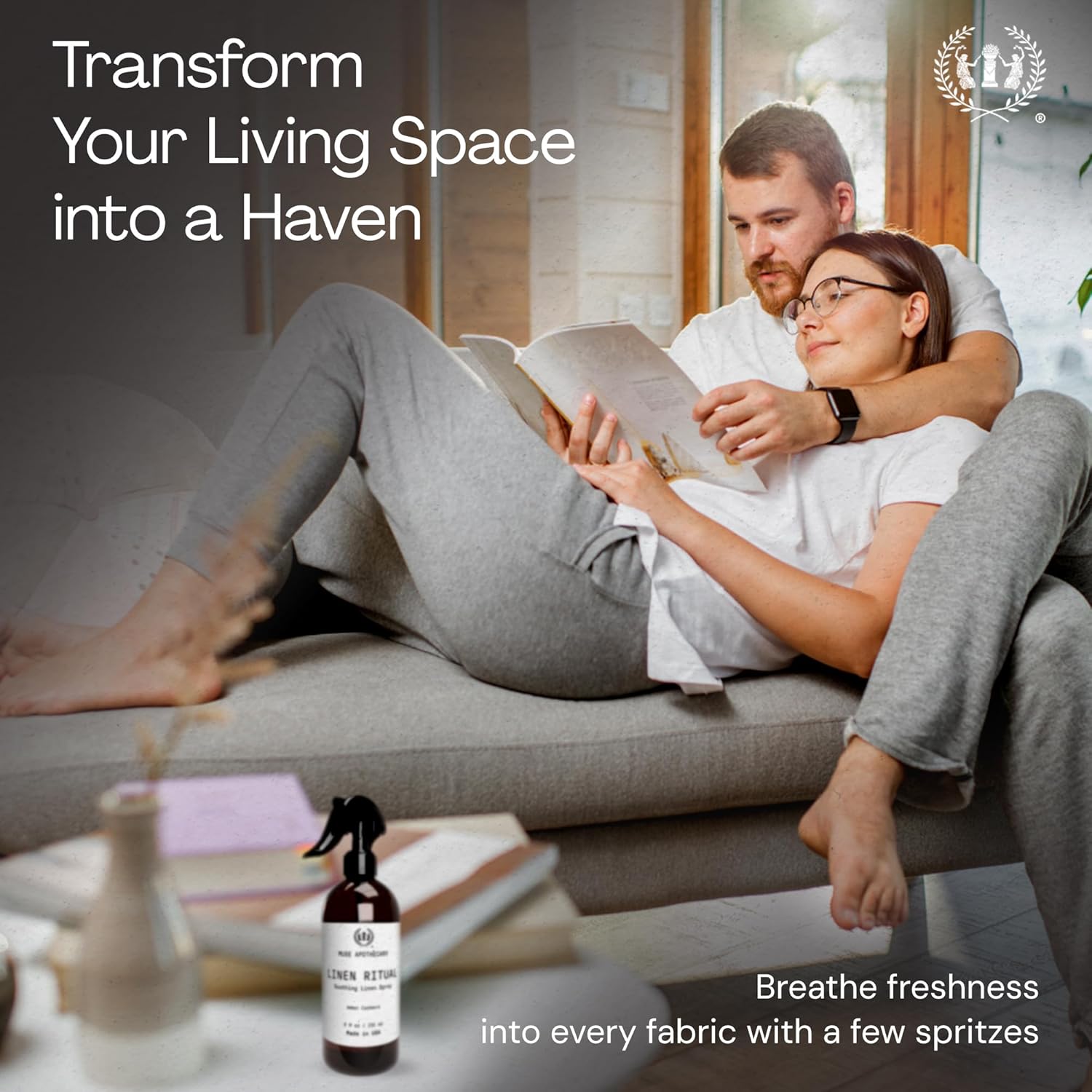 - Linen Ritual - Soothing, relaxing, and calming linen mist imparts therapeutic aromas onto your fabrics and beddings or anywhere else. Spritz it onto your clothing, laundry, linens, pillows, blankets, comforters, sheets, towels, closets, furniture, yoga mats, or bathroom to immerse yourself in total relaxation. Perfect for home and on the go!