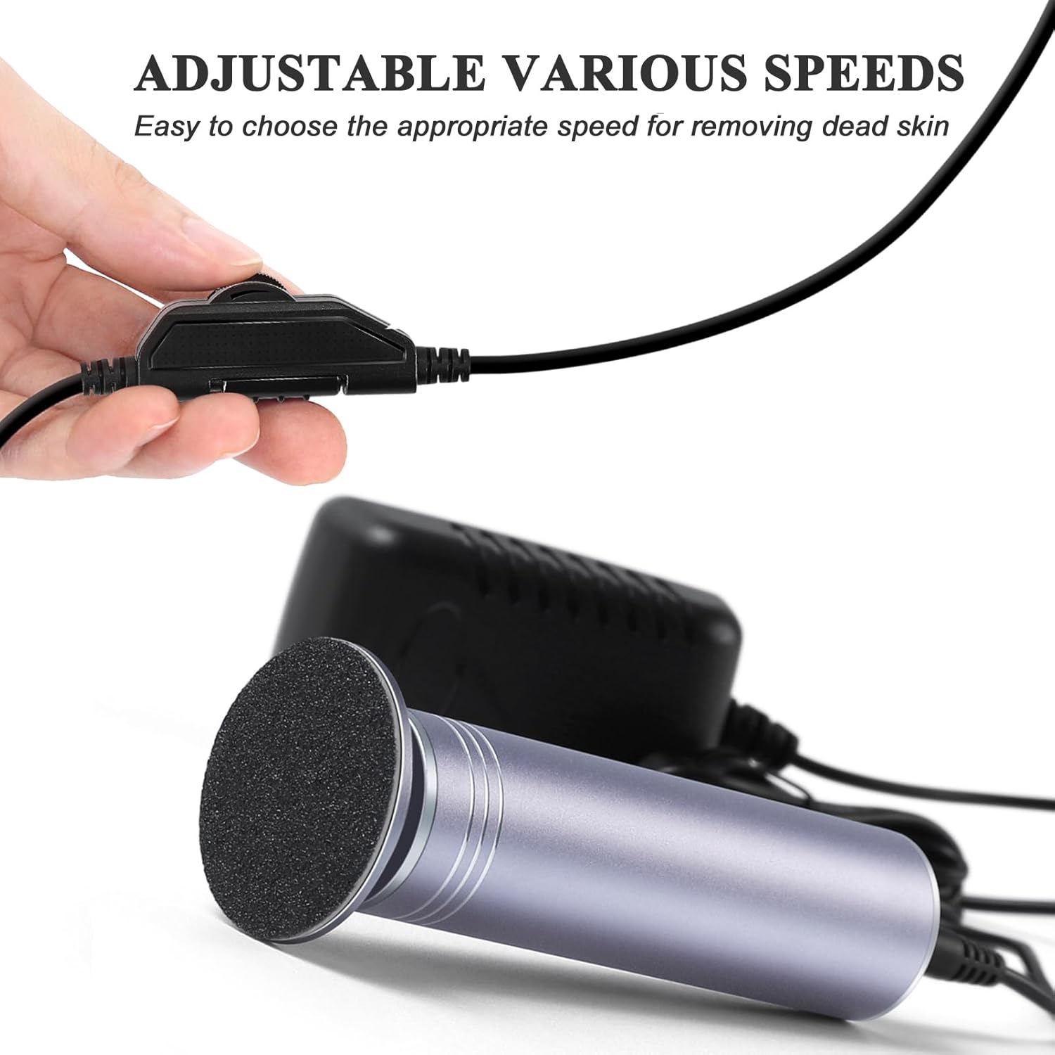 - NOT BATTERY POWERED, STRONG POWER: The electric callus remover is not battery powered, don't worry about low battery issues when using it. You just need to plug the adapter into an outlet and you can use the electric foot file right away.
