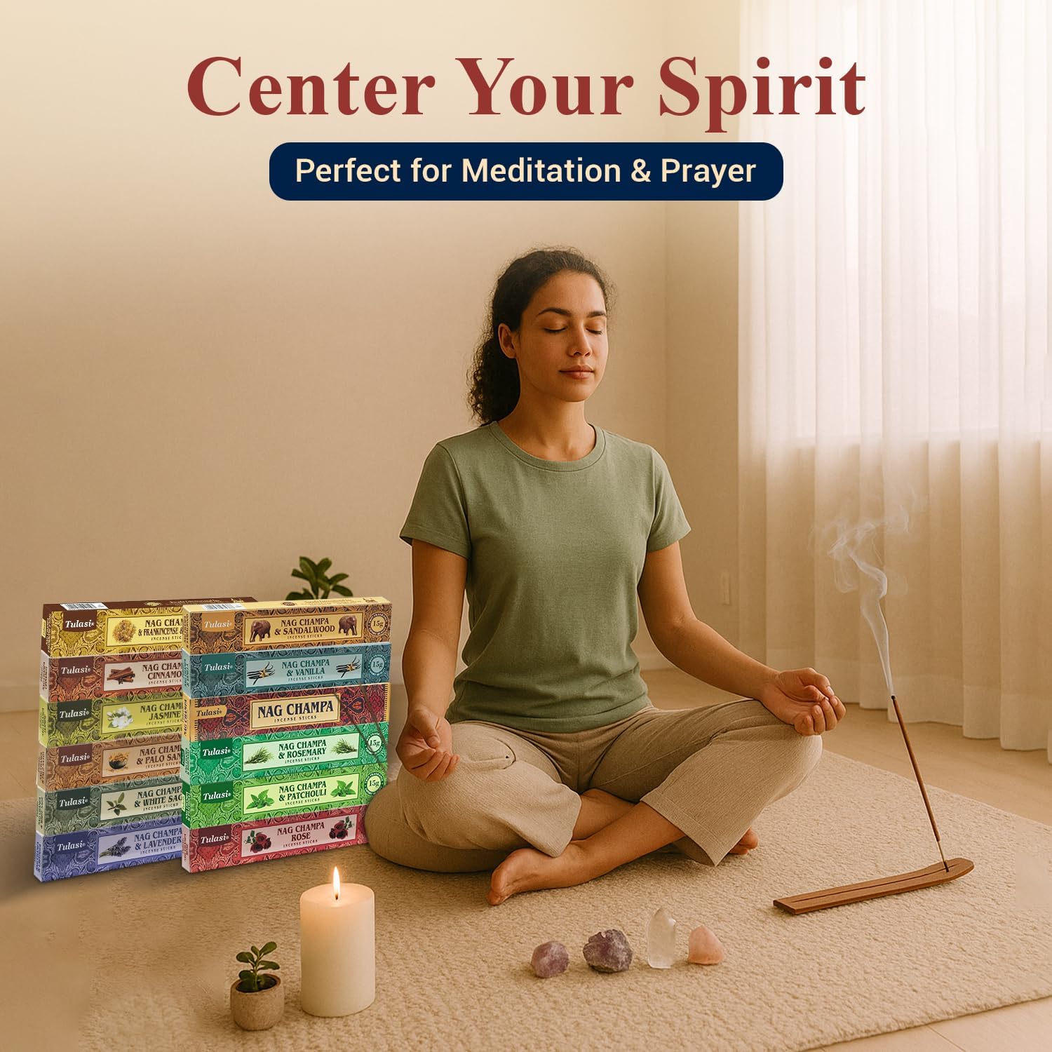 - SET INCLUDES: 180 incense sticks (12 x 15Pc). This Tulasi Incense Stick Gift Pack includes 12 different fragrances boxes, each box containing 15 sticks | Nag Champa, Sandalwood, Vanilla, Rosemary, Patchouli, Palo Santo, Red Rose, Lavender, White Sage, Frankincense & Myrrh, Cinnamon, Jasmine.
