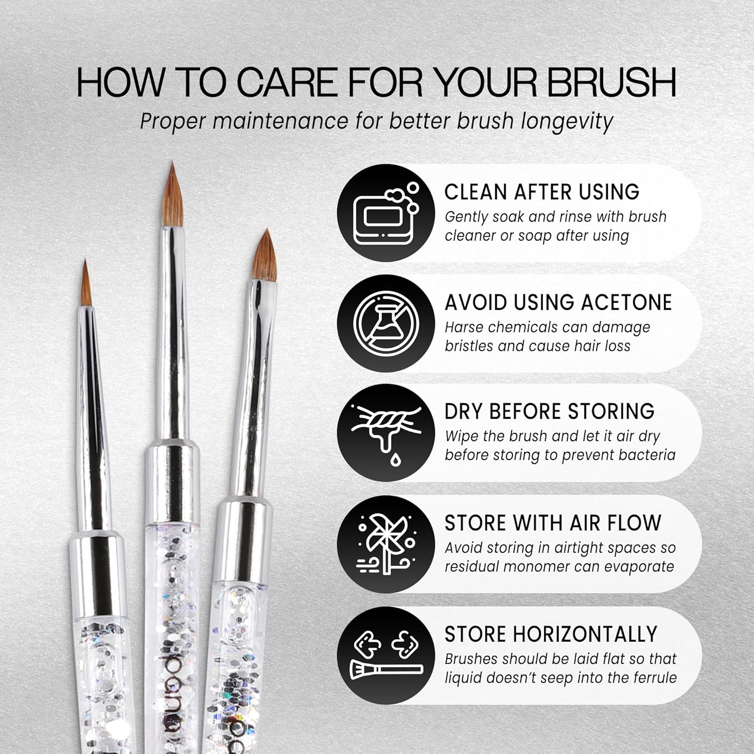- [Design] Featuring a slim handle with eye-catching, shimmering glitter and a sleek silver ferrule, this 3D nail art brush offers both elegance and precision, making it ideal for intricate detailing.