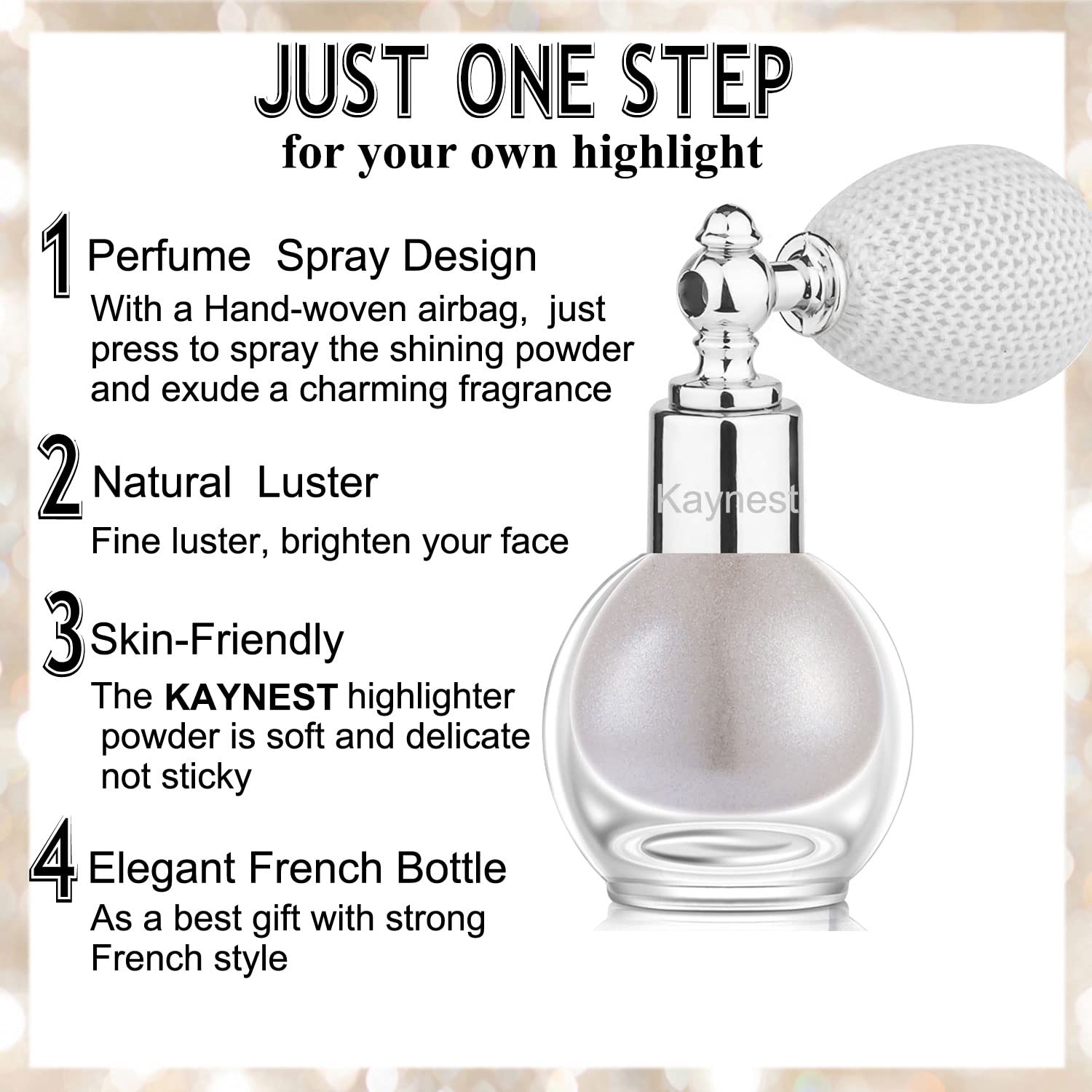 - KAYNEST HIGHLIGHTER SPRAY : The highlight powder made of light and thin refreshing texture, can effectly enhance the stereoscopic facial contour, make the face sparkle and leave your makeup more shine and charming.