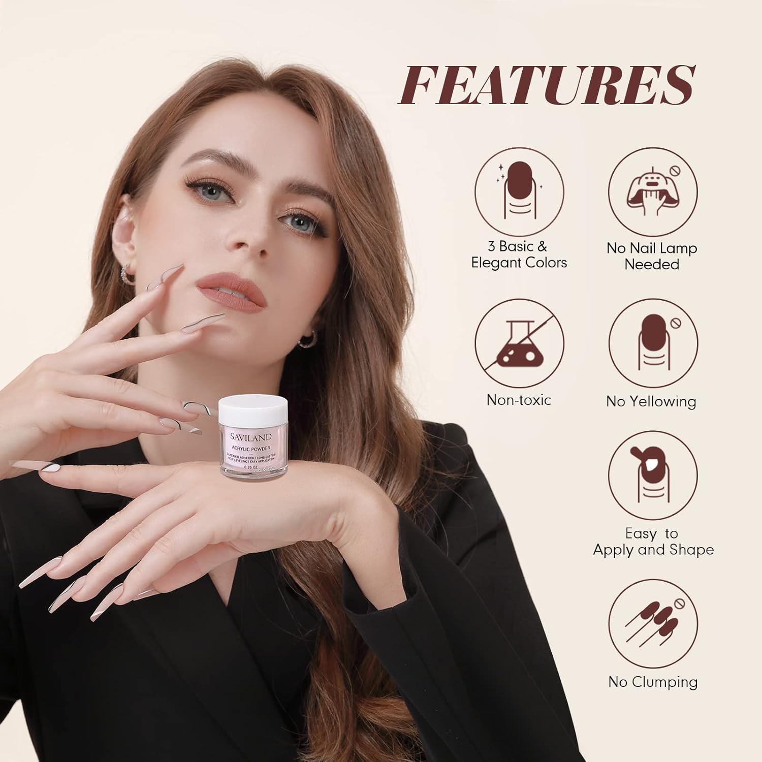- EASY TO APPLY & AIR DRY NATURALLY: Saviland acrylic powder is ultra fine and easy to apply with acrylic nail brush and acrylic liquid, perfect to practice with nail hands, it is easy to shape and self-leving. No nail lamp neede, no worry to darken your skin. The acrylic nails create a protective and hard layer to cover and protect your natural nails after air dry naturally, which will not easily lift, split or peel off. The finish effect can last for at least 28 days.