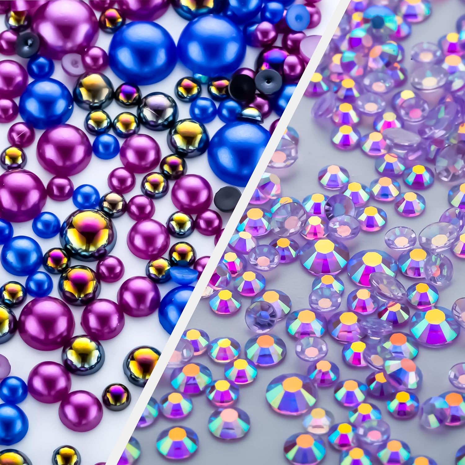 60g Dark Blue Flat Back Pearls Rhinestones for Crafts Mixed Size 3mm-10mm AB Color Round Half Pearls Flatback Pearl Beads and Resin Rhinestones Set for Face Art with Glue