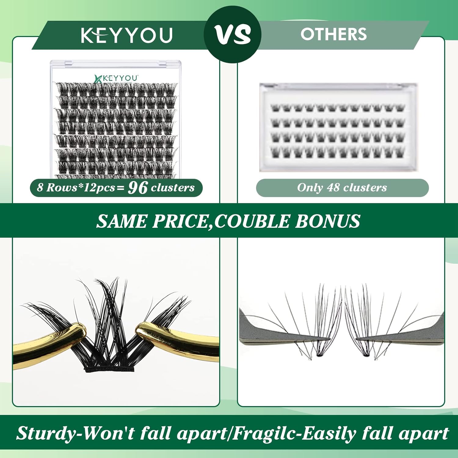 - 【Soft&Comfortable】KEYYOU lash cluster are made of imported materials,the stem line is thinner and softer, the eyelash cluster are lighter and more comfortable to wear.96 clusters in one tray ,more cost-effective.