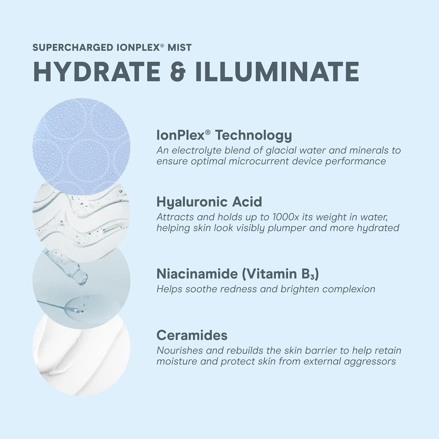 - Supercharged Hydration - This 3-in-1 facial mist deeply hydrates skin to enhance your microcurrent treatment and refresh skin throughout the day. Formulated to lock in moisture, and reduce the look of fine lines, and pores for a lasting radiant appearance.
