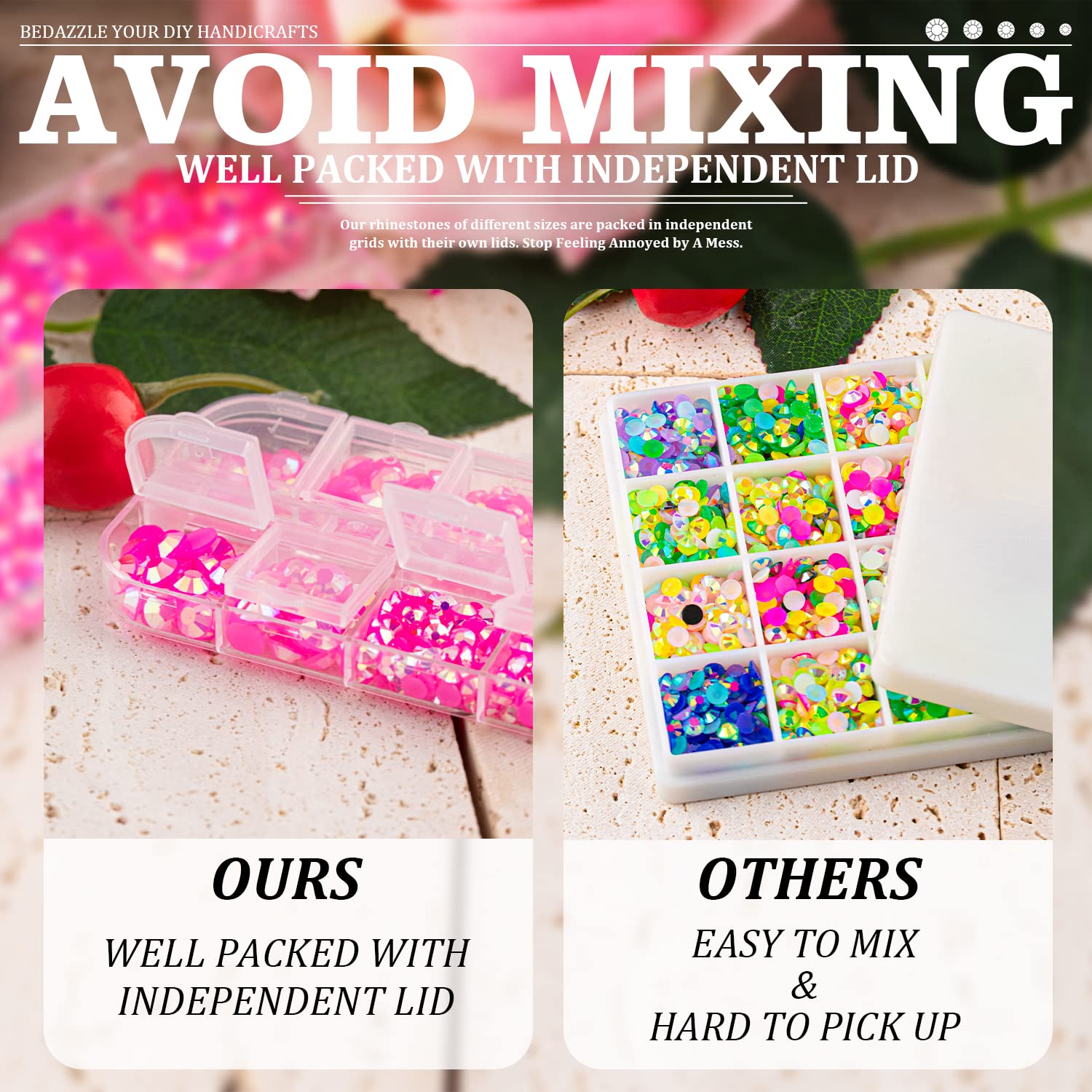 - 💎INDEPENDENT LID FOR EACH GRID -- The 12-grid box features 12 individual lids, ensuring that each compartment is completely separate from the others. This design allows for easy organization of various sizes of resin rhinestones without the worry of mixing or spilling.