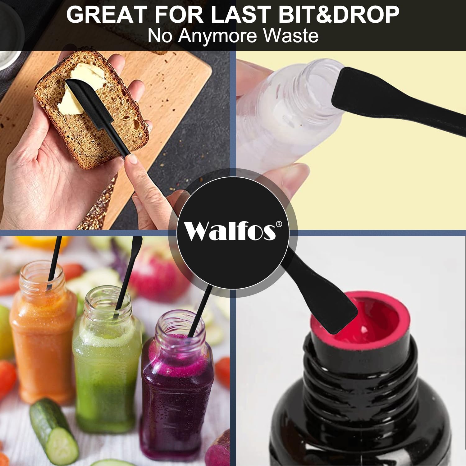 - 【DOUBLE-ENDED DESIGN & MULTIPURPOSE】– One side is mini spoon and the other side is silicone scraper. Spatulas have widely usages. Suitable for peanut butter and ketchup, Jars, Honey, Cosmetics, Makeup, Hand Lotion, Pain Cream, Body Lotion, Foundation, Hair Products, Shampoo, Conditioner, Lip gloss, Nail Polish, and so on.
