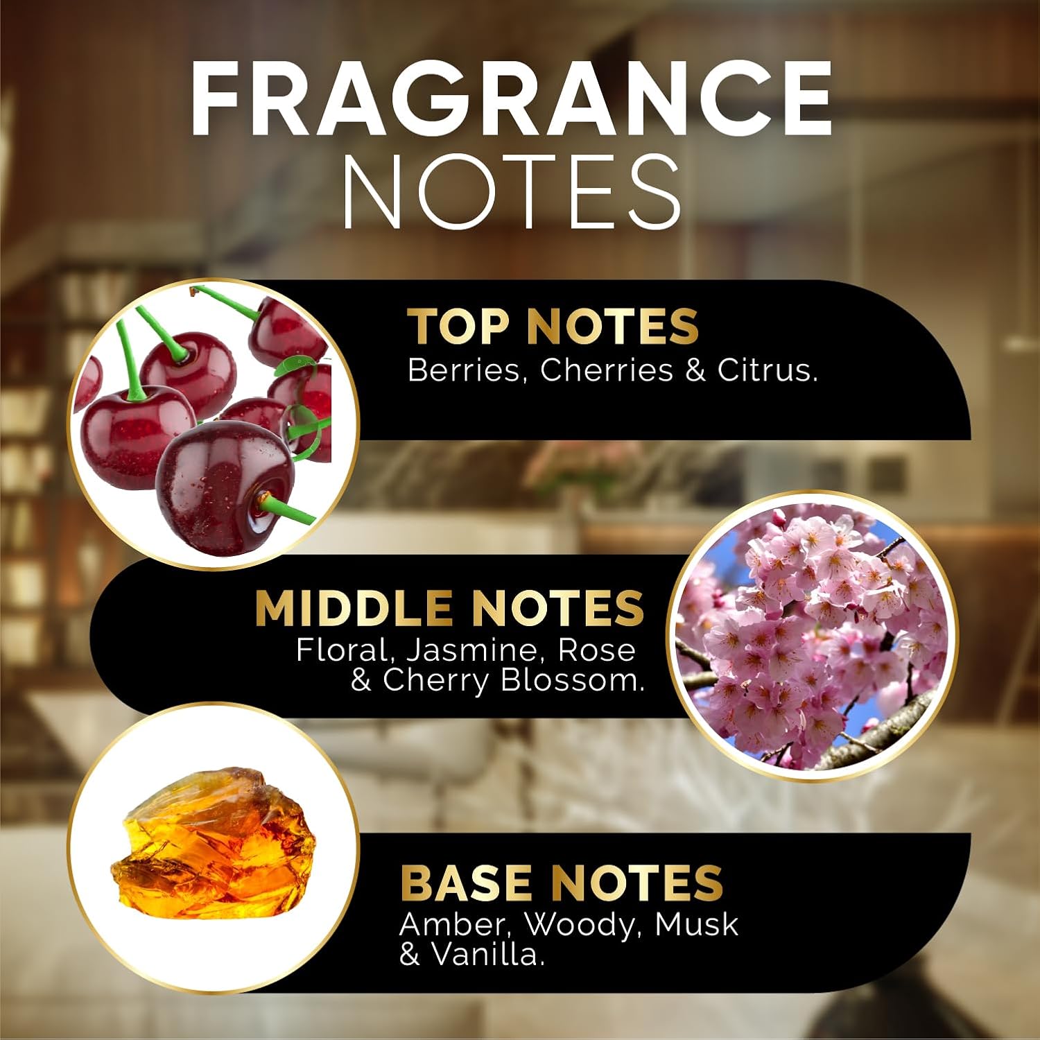 - Key Notes: Cherries | Rose | Amber. Bright berries, cherries, and citrus. Flow into jasmine, rose, and cherry blossom's floral heart. End with a warm blend of amber, woody elements, vanilla, and musk.