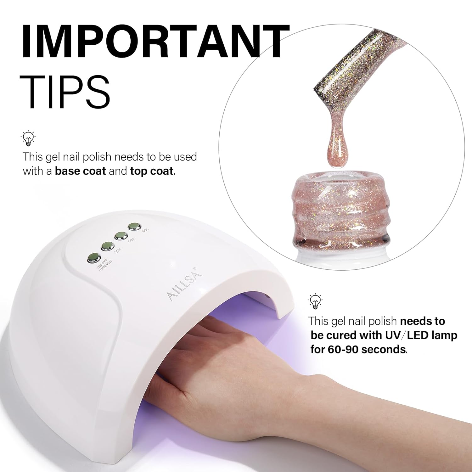 • SPARKLE & EASY TO APPLY - AILLSA glitter gel polish is made from natural resin to keep our products in strict compliance with SGS standards. It has a unique high color saturation with perfect shine, smooth application and no brush marks.