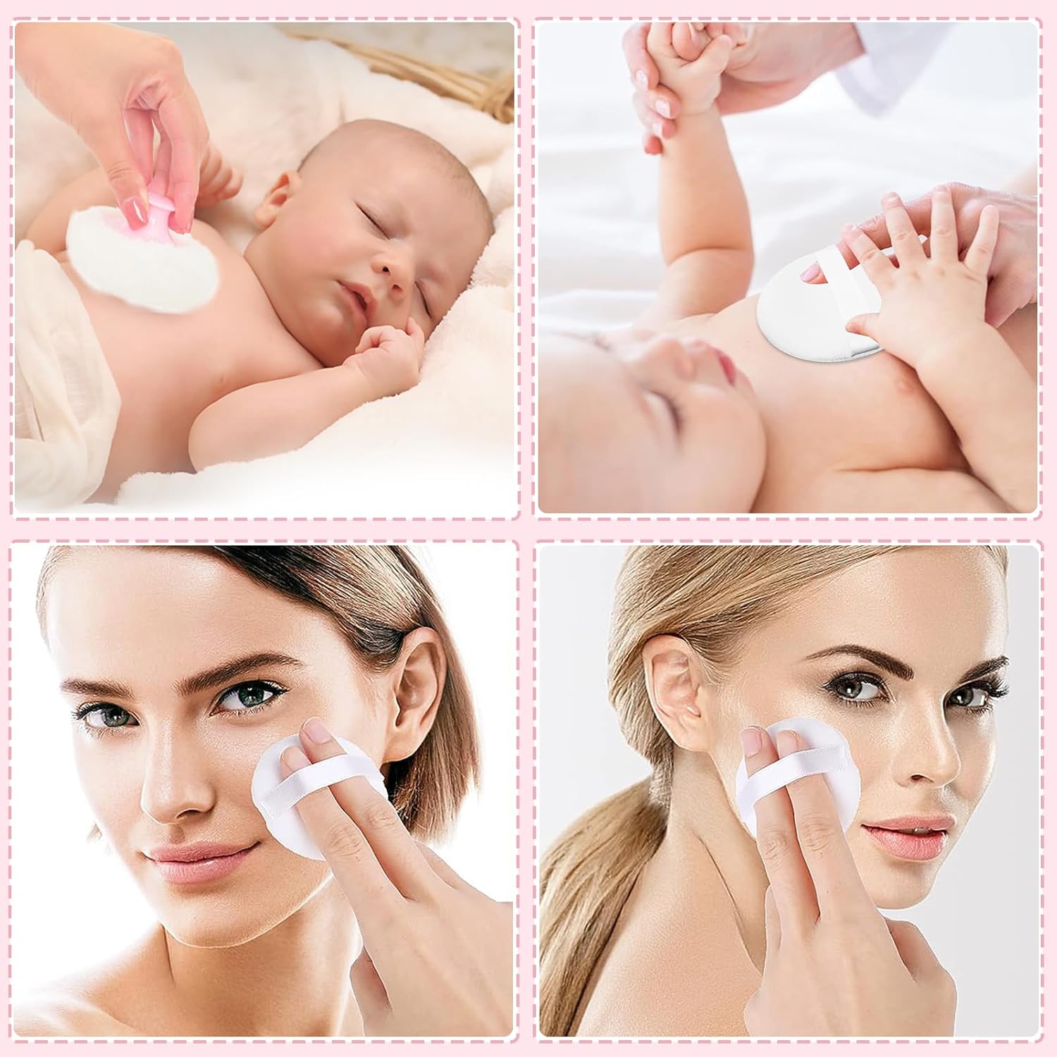 - ă2 Body Powder Puffsă: Considering the daily needs of our customers, our body powder container is equipped with 2 body powder puffs which made of delicate and smooth touch artificial woolïŒodorless, individually packaged. The large powder puff with a handle can directly take an appropriate powder apply for body, fast and convenient! The small puff (2.36 ") can take a small amount of powder more delicate and apply evenly on baby skin.