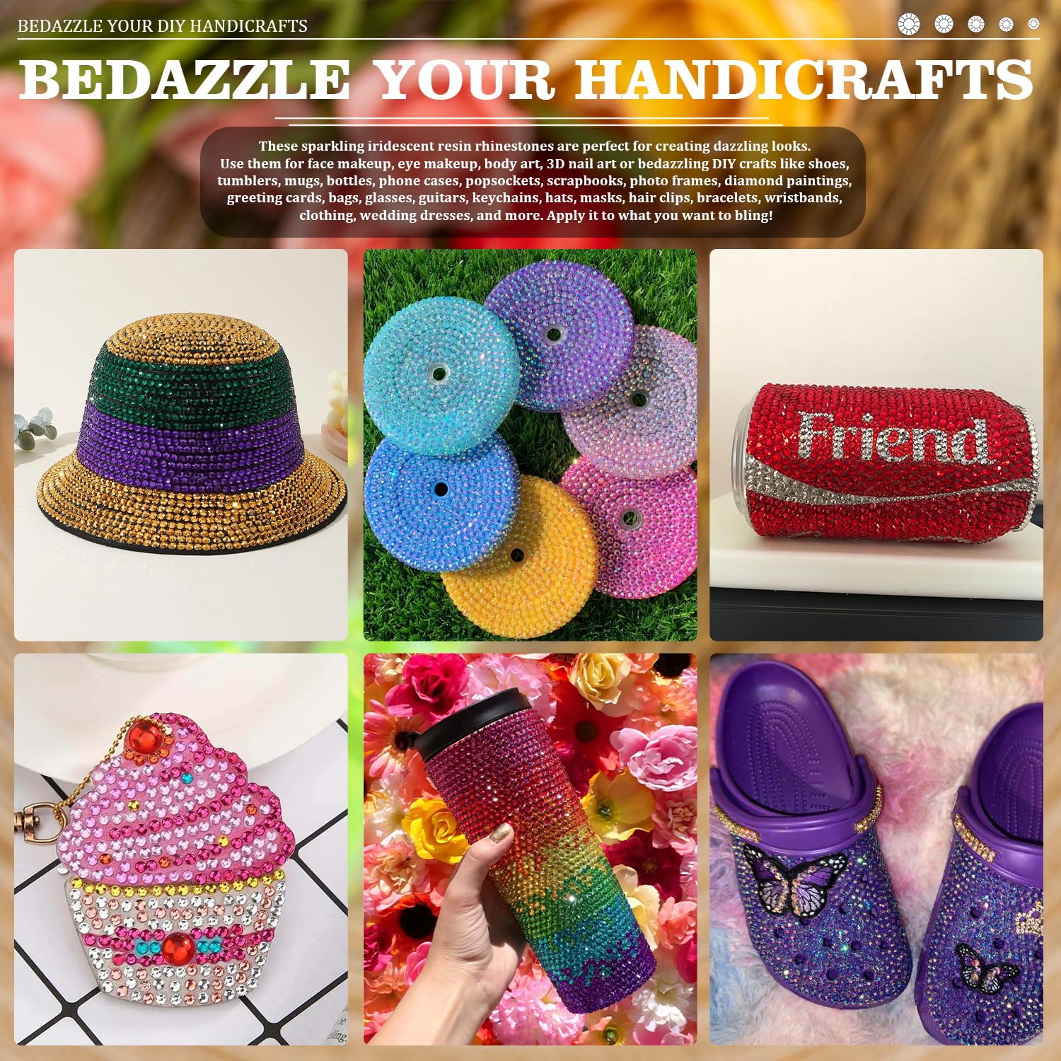 - 💎WIDE APPLICATION -- These sparkling iridescent resin rhinestones are perfect for creating dazzling looks. Use them for face makeup, eye makeup, body art, 3D nail art or bedazzling DIY crafts like shoes, tumblers, mugs, bottles, phone cases, popsockets, scrapbooks, photo frames, diamond paintings, greeting cards, bags, glasses, guitars, keychains, hats, masks, hair clips, bracelets, wristbands, clothing, wedding dresses, and more. Apply it to what you want to bling!