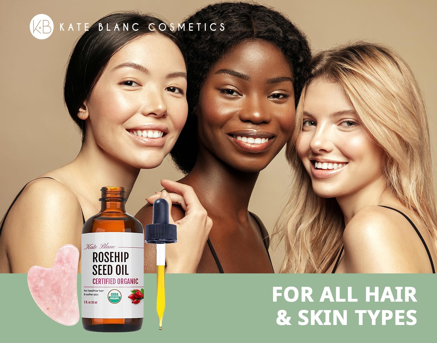Kate Blanc Cosmetics Rosehip Oil for Face with Pink Gua Sha Stone (1oz, Organic, Pure, Cold Pressed) Rosehip Seed Face Oil for Gua Sha Massage