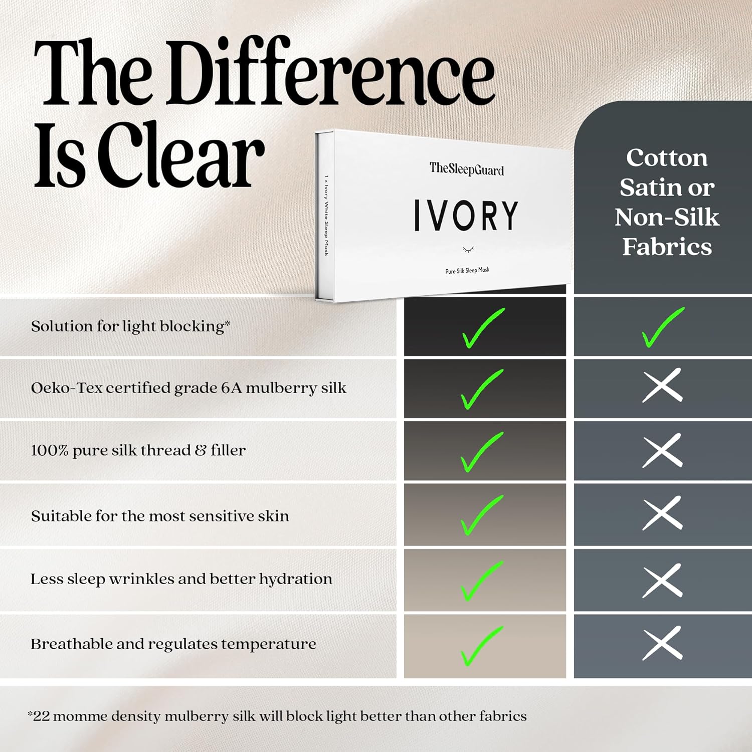 - ✅ INVEST IN YOUR SLEEP - Experience TheSleepGuard difference with our luxury sleeping masks. Crafted from the highest grade 6A Mulberry silk at 22 momme and certified by Oeko-Tex to ensure you sleep soundly. Remember, better sleep leads to a better you.