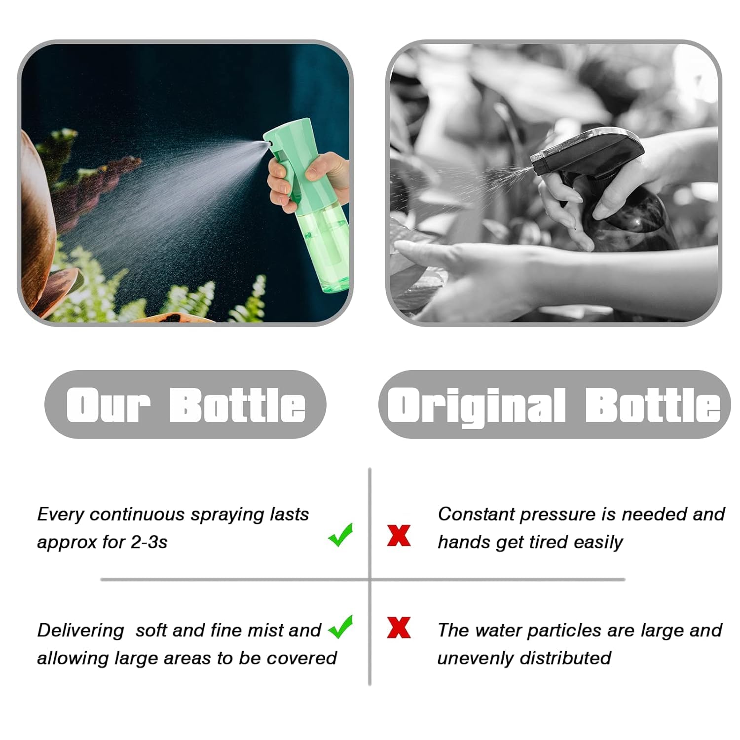 - 【High Quality】The continuous mist spray bottle is made of quality PET material with advanced technology, strong and not easily dented, durable and refillable. BPA-free, no smell, no leakage, and refillable. If anything goes wrong with your continuous spray bottle, please contact us directly.