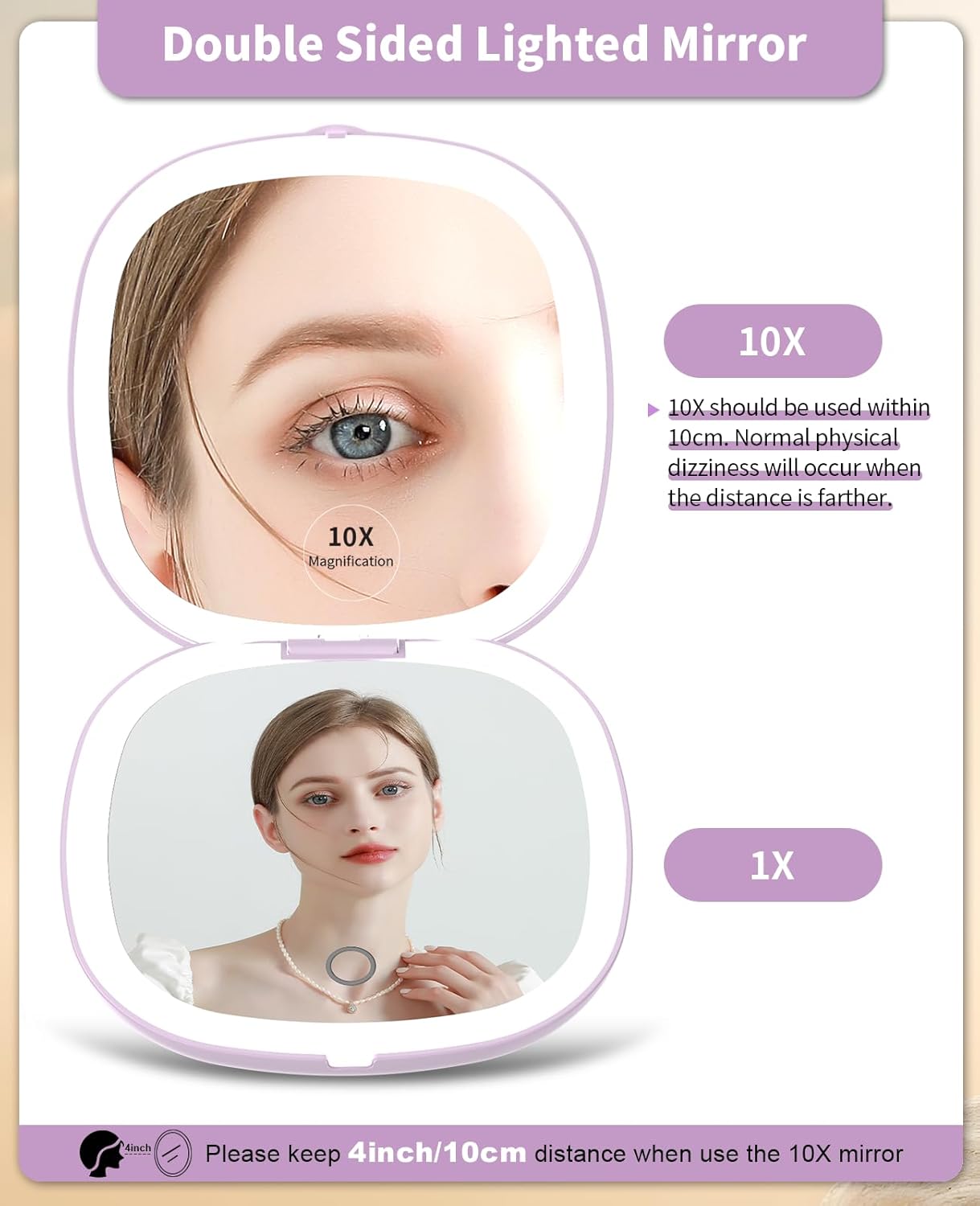 WOBSION Rechargeable Lighted Travel Makeup Mirror,1x/10x Compact Magnifying Mirror with Lights,Portable for Bag,4inch,Gift,Purple