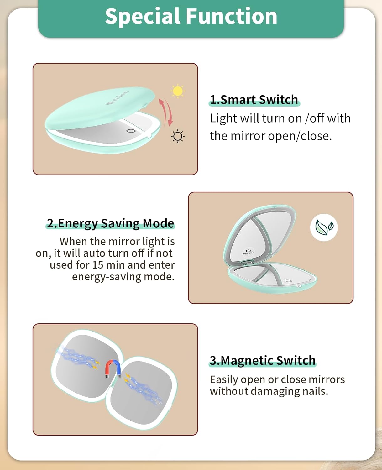 - 10x Magnifying:One side is a 1x HD mirror, equipped with white light to better restore your beauty, and the other side is a 10x magnifying mirror, which can help you magnify facial details. Tip: When using the 10x magnifying mirror, please keep a distance of less than 10 cm, otherwise it may cause normal dizziness and affect imaging