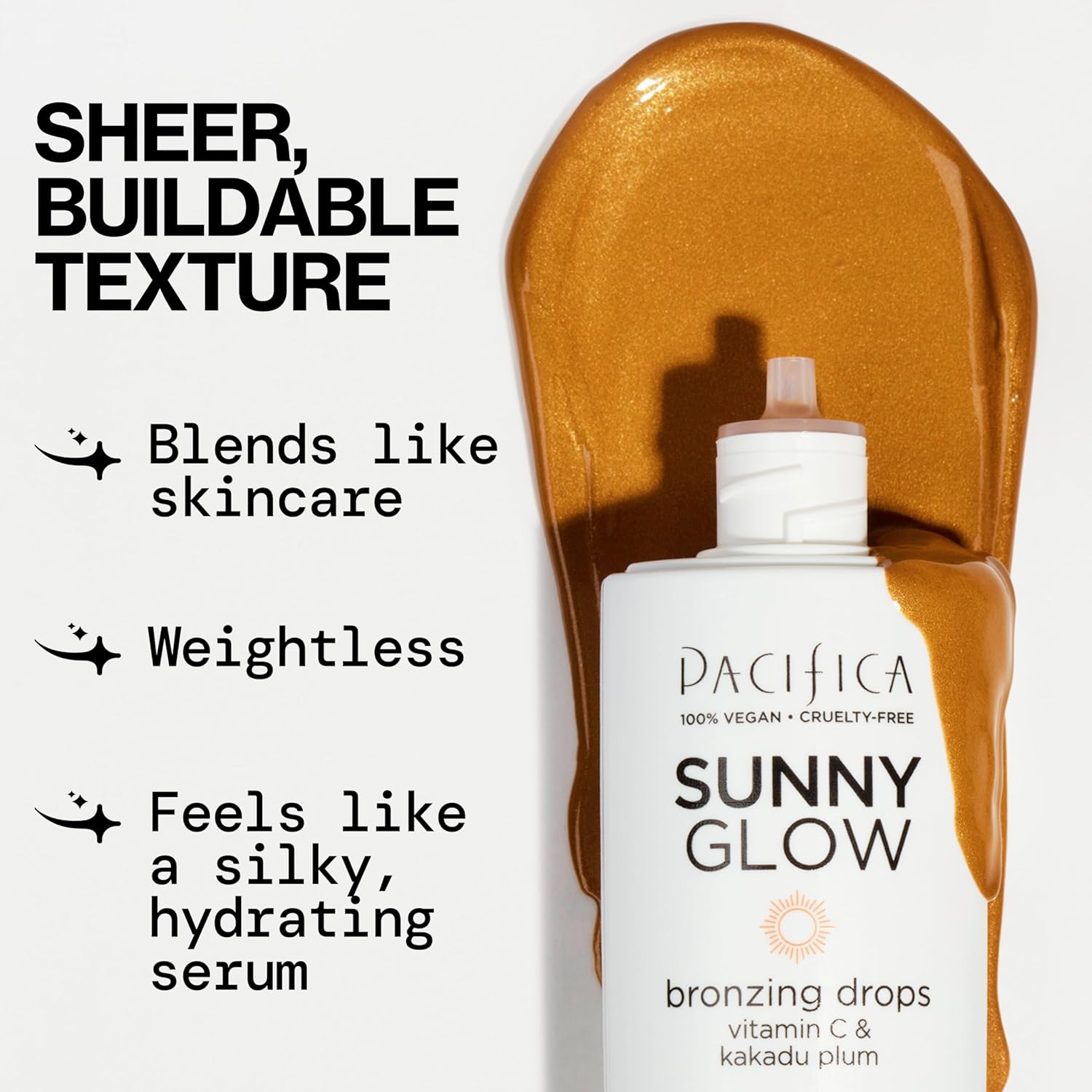 - Clean, Vegan Beauty Elixir: Pacifica’s Sunny Glow Bronzing Drops are 100% vegan and cruelty-free, formulated without parabens, phthalates, or mineral oil. The nourishing formula includes plant-based ingredients like extracts from fruits and flowers to benefit your skin. Because it’s a liquid bronzer with skincare-grade ingredients, you won’t clog pores or cause breakouts. Achieve a radiant bronzed look while hydrating and treating your skin with clean, ethical ingredients. It’s summer in a bottle, suitable for all skin tones, with zero sun exposure required.