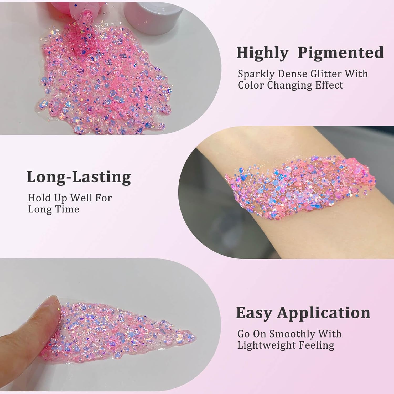 MEICOLY Chameleon Baby Pink Body Glitter,Pink Turn to Purple Face Glitter Paint,Color Changing Mermaid Face Glitter Gel for Halloween,Chunky Glitter for Face Body Hair,Festival Party Glitter Makeup