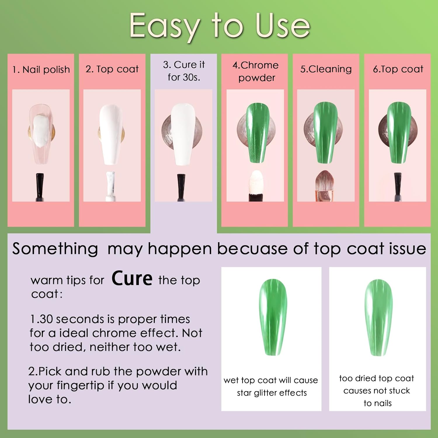 - Wide Usage: Allstarry Chrome Nail Powder Set comes in 2 colors, which can perfectly match with st patricks day accessories, chameleon flakes, nail charms, french manicures, 3D shell nails, etc, meeting your needs for different works. Whatβs more, the chrome powder for nails can also be applied on UV gel nails, acrylic nails, and natural nails, and it can be mixed into nail gel polish or chrome nail polish for its solvent resistance.