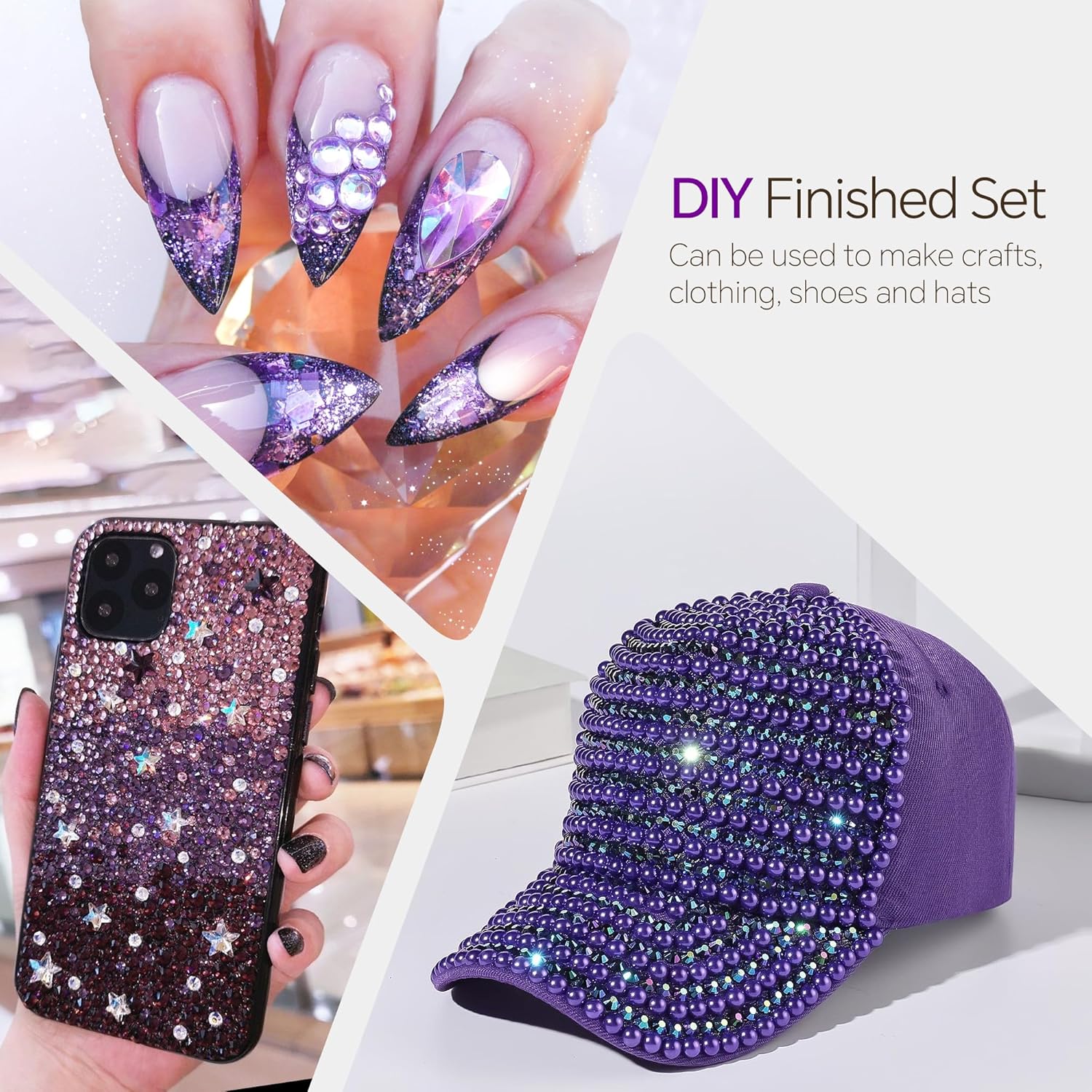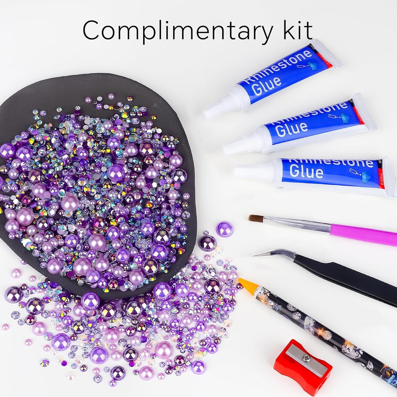 60g Purple AB Flat Back Pearls Rhinestones for Crafts Mixed Size 3mm-10mm AB Color Round Half Pearls Flatback Pearl Beads and Resin Rhinestones Set for Face Art