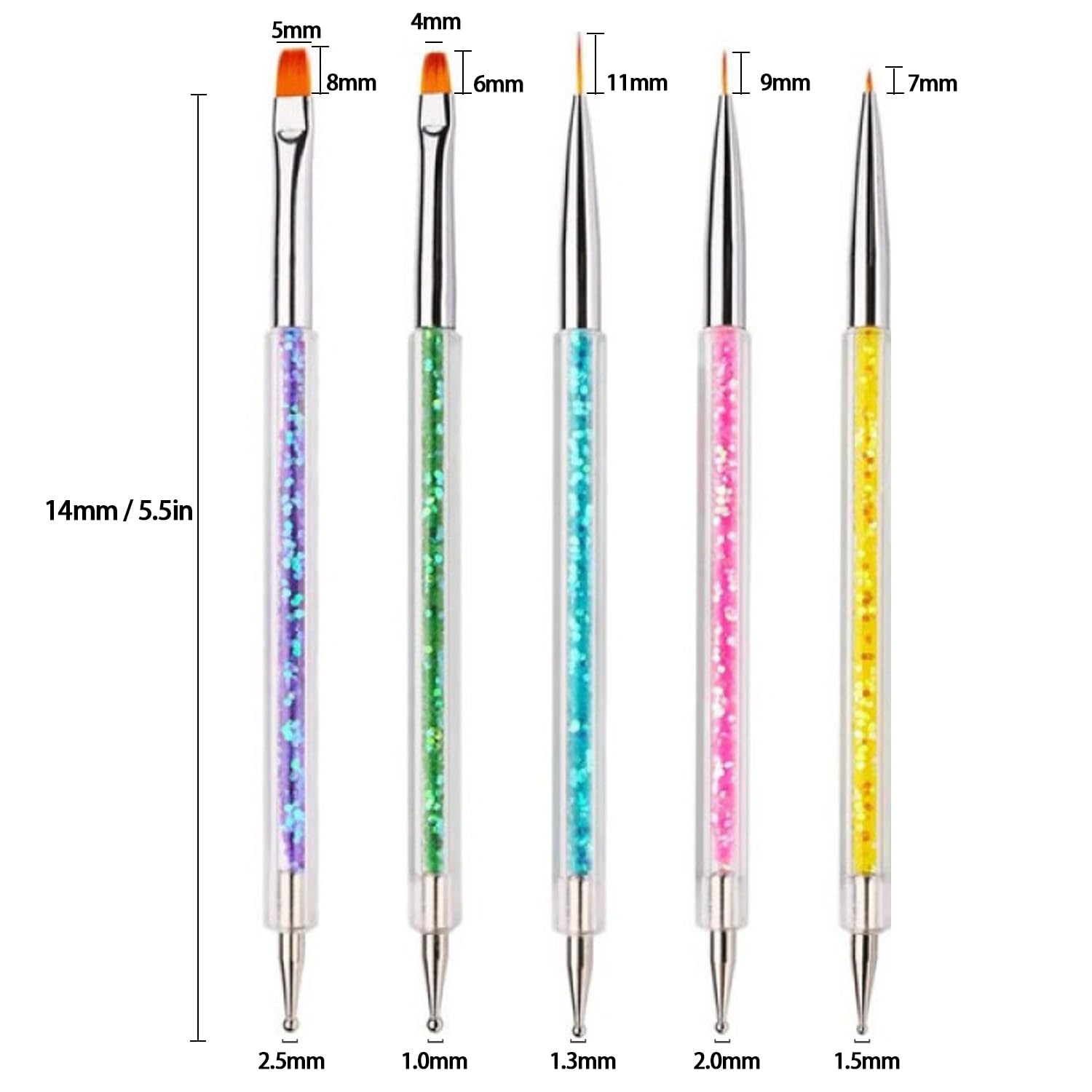 AIBEE Nail Art Brushes, 5pcs Double-Ended Acrylic Nail Brush Including 7/9/11mm Nail Liner Brush Flat Brushes and Nail Dotting Tools for Nail Art Design