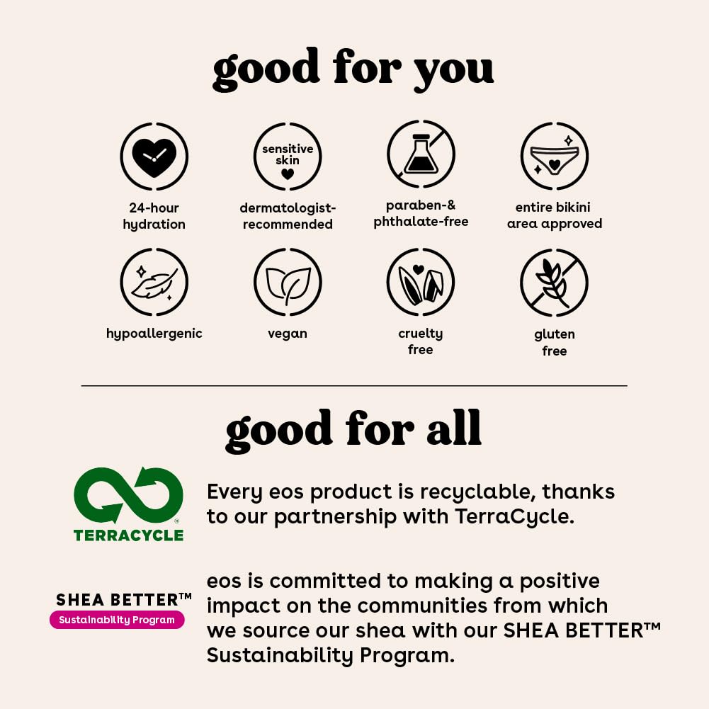 - ALL-NATURAL SHEA BUTTER: These vegan shave creams have wild grown, sustainably sourced 100% natural shea butter. eos Shave Cream + eos Body Lotion are paraben, phthalate and gluten-free. Leaping bunny certified. No products tested on animals