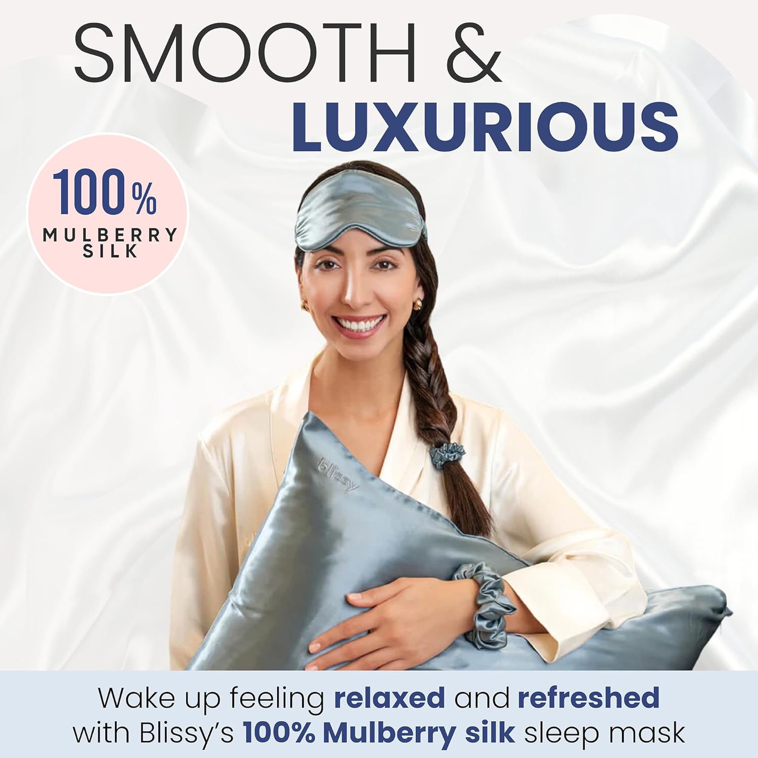 Blissy Silk Sleep Mask - Silk Eye Sleeping Mask for Women & Men for Total Blackout - 100% Pure Mulberry Silk, 22 Momme 6a Fibers - Blindfold Silk Sleep Mask Side Sleeper Eye Cover (Ash Blue)
