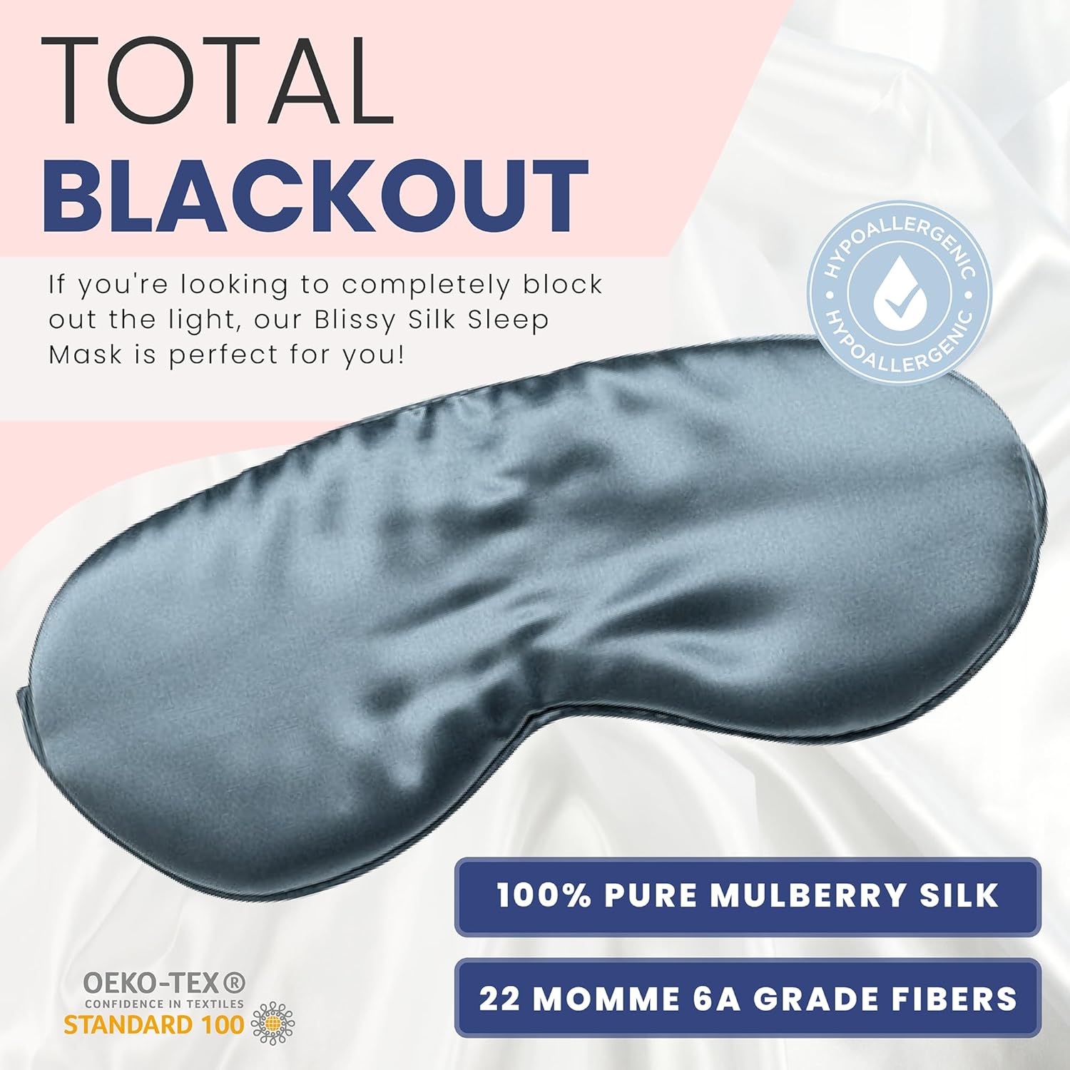 - TOTAL BLACKOUT - If you're looking to completely block out the light, our Blissy Silk Sleep Mask is perfect for you! Made with 100% pure Mulberry silk and 22 momme 6A grade fibers, this mask will keep the light out and help you get a good night's sleep.
