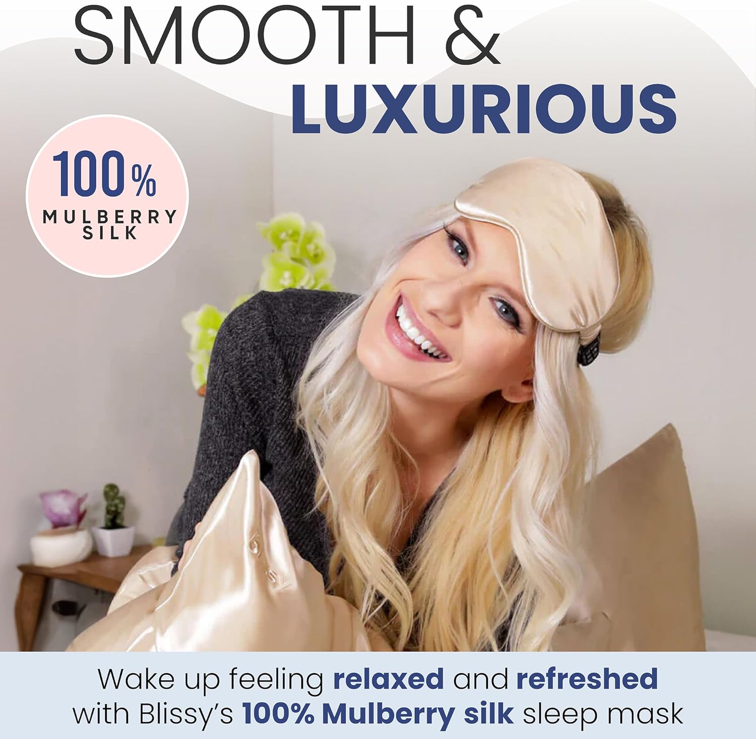 Blissy Silk Sleep Mask - Eye Sleeping Mask for Women & Men for Total Blackout - 100% Pure Mulberry Silk, 22 Momme 6a Fibers - Blindfold Sleep Mask Side Sleeper Eye Cover (Champagne)