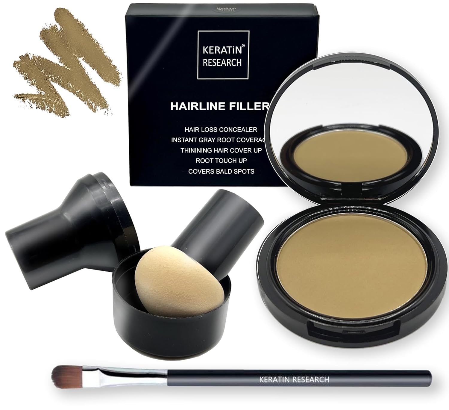 - ROOT CONCEALER- Keratin Research Hairline Filler, a Premium Root Cover Up, is your secret weapon for at home or on-the-go. Camouflage roots and grays instantly, giving you full great looking hair! The Cover Up Powder also conceals thinning hair and hair loss, for an instant look of healthy volume. Packaging includes a large mirror and a great mushroom applicator. Root touch up powder is resistant to rain, sweat, and wind.